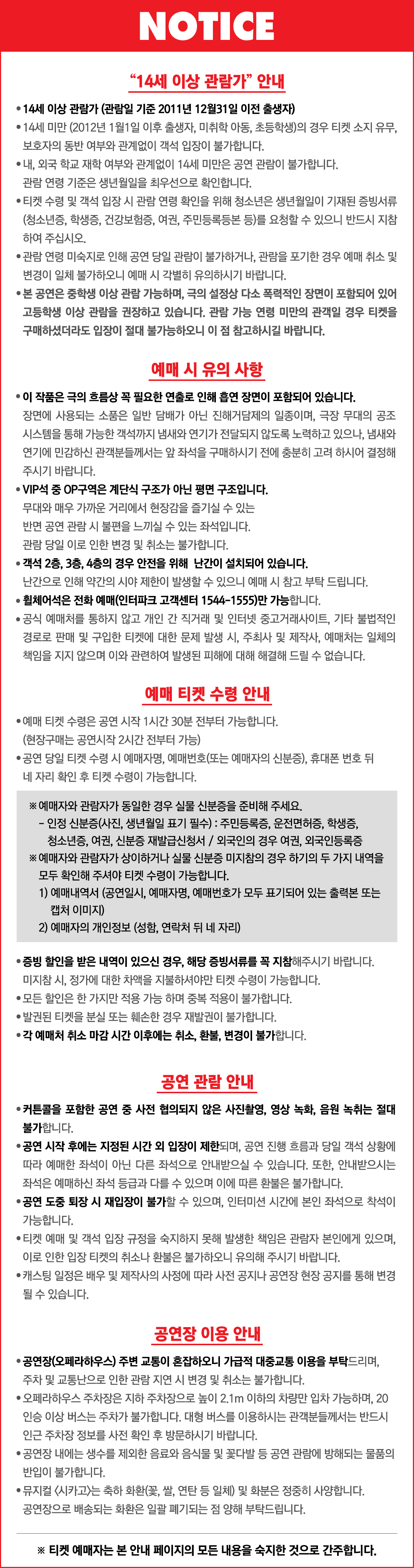 (화,수,목,금) 19:30 / (토,일) 14:00, 18:30 / 월요일 공연 없슴
