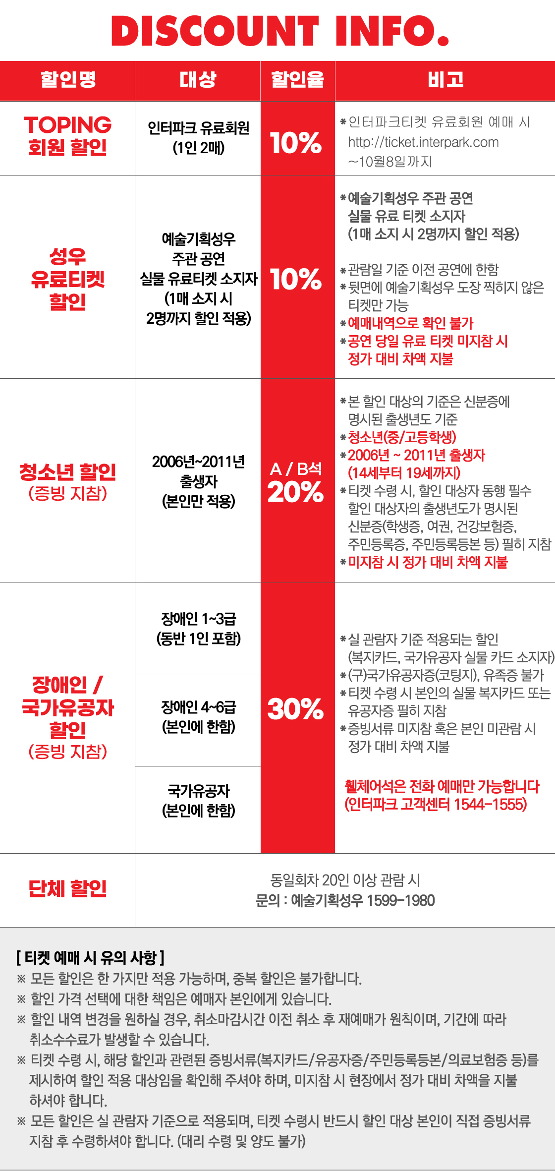 - 관람일 2일전 ~ 취소기한까지: 티켓금액의 30%