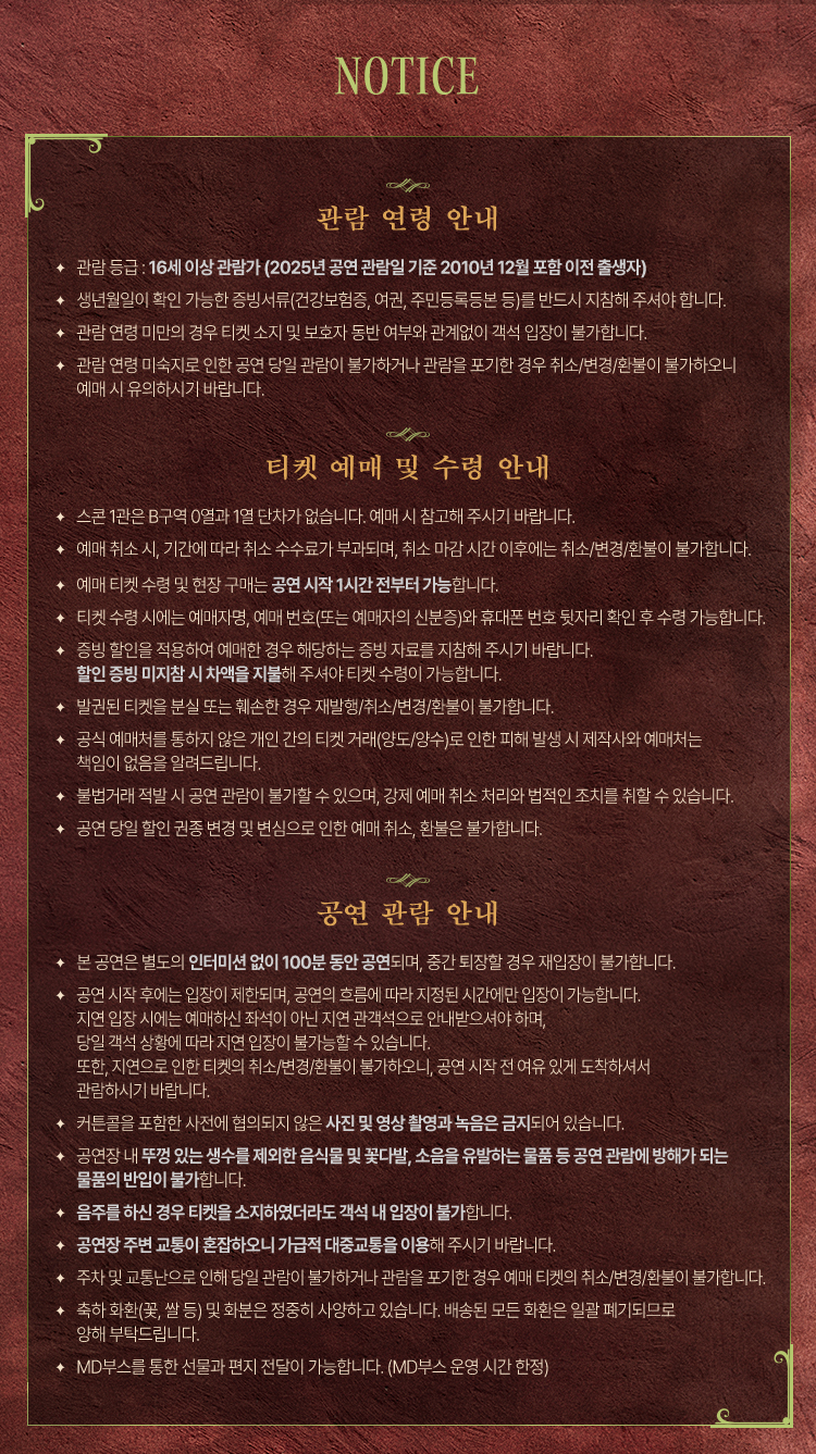 - 관람일 2일전 ~ 취소기한까지: 티켓금액의 30%