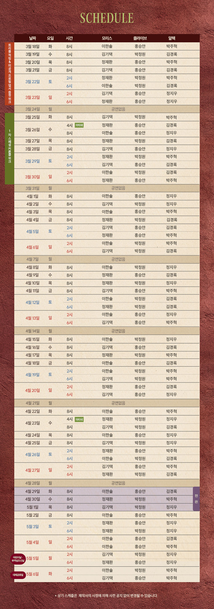 화, 수, 목, 금 8시 ㅣ 토, 일, 공휴일 2시, 6시 (월 쉼)