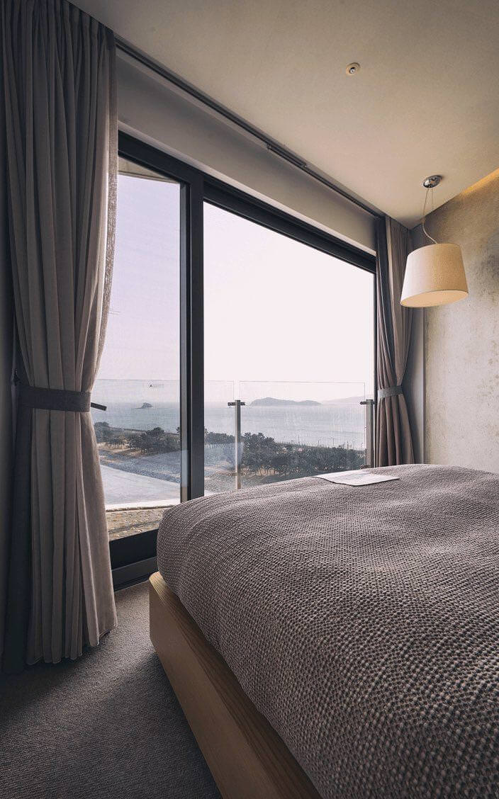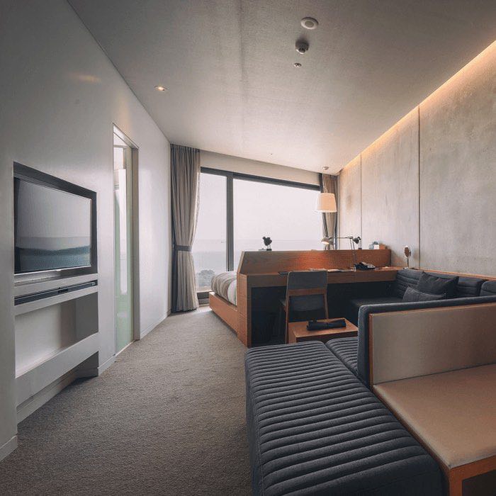 대부분의 객실이 오션뷰를 향한 쪽만 통유리로 되어있는 것에 반해 모서리를 끼고 두 면이 통유리로 된 코너 스위트는 가장 시원한 전망을 자랑한다. 덕분에 바다는 물론, 강릉 도심도 두루 조망할 수 있다. 어디서나 햇살이 가득해 지중해 어디론가 여행을 온 듯한 나른한 기분마저 든다. 테라스 문을 살짝 열어두면 저 멀리서부터 들려오는 아득한 파도소리를 들으며 일상의 소란스러움은 잠시 묻어두게 된다.