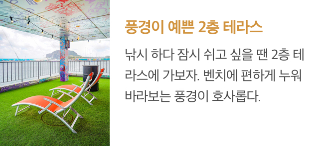 2층엔 전 객실 오션뷰인 아일랜드에프 해상호텔이 있다. 낚시 체험을 끝낸 뒤 육지로 나갈 걱정 없이 몸을 쉴 수 있어 좋다. 1,000t 바지선에 지어진 호텔이라 흔들림 없이 아늑하단 것도 큰 장점. 발코니에서 최고의 일출과 눈앞에서 리얼하게 출렁이는 바다를 만끽해보자.