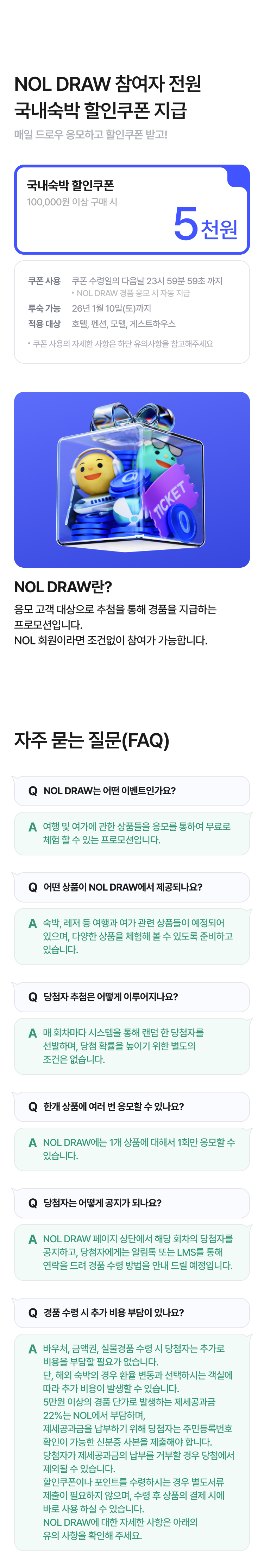 - NOL DRAW에서 경품은 실물, 모바일 바우처, 교환권, 할인쿠폰, NOL 포인트, 여행패키지 상품의 형태로 제공되며, 제공될 상품의 형태는 업체와 상품의 카테고리에 따라 상이할 수 있습니다