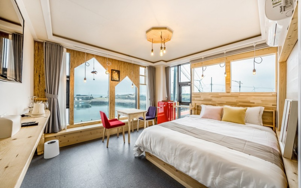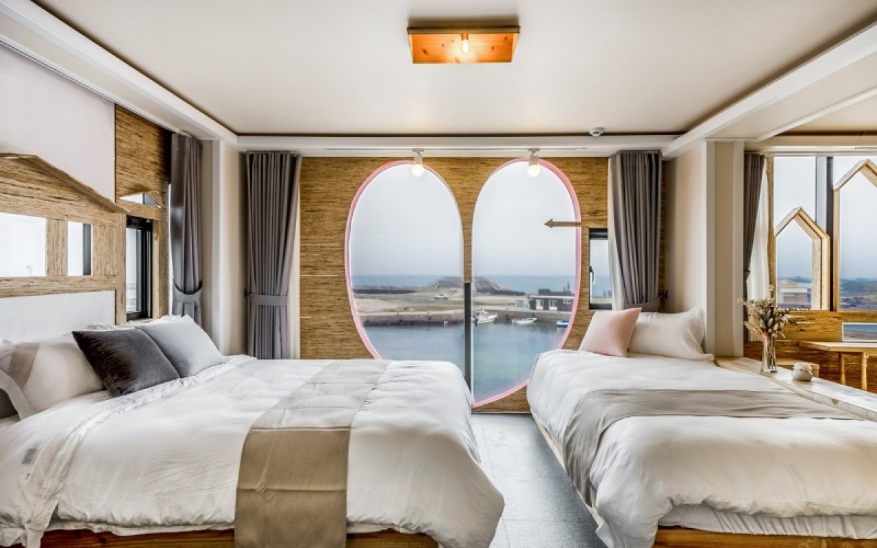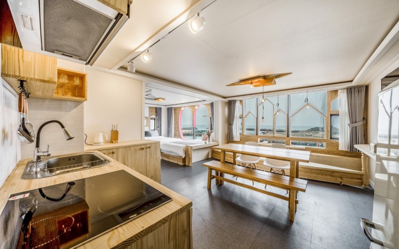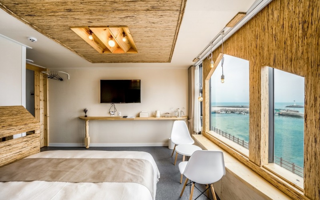 킹 침대 1개, 싱글 침대 1개깔끔하고 아기자기한 분위기로, 바다와 가까운 위치에 있어 편리한 접근성을 제공합니다. 숙소는 넓고 청결하며, 바다 전망이 인상적이며, 1층에는 코인 세탁방과 편의점이 있어 편리합니다. 사장님은 친절하며, 손님을 위한 배려가 돋보이며, 특히 컵라면과 같은 간단한 서비스가 제공됩니다. 전반적으로 조용하고 편안한 힐링 공간으로, 재방문 의사가 높은 곳입니다.