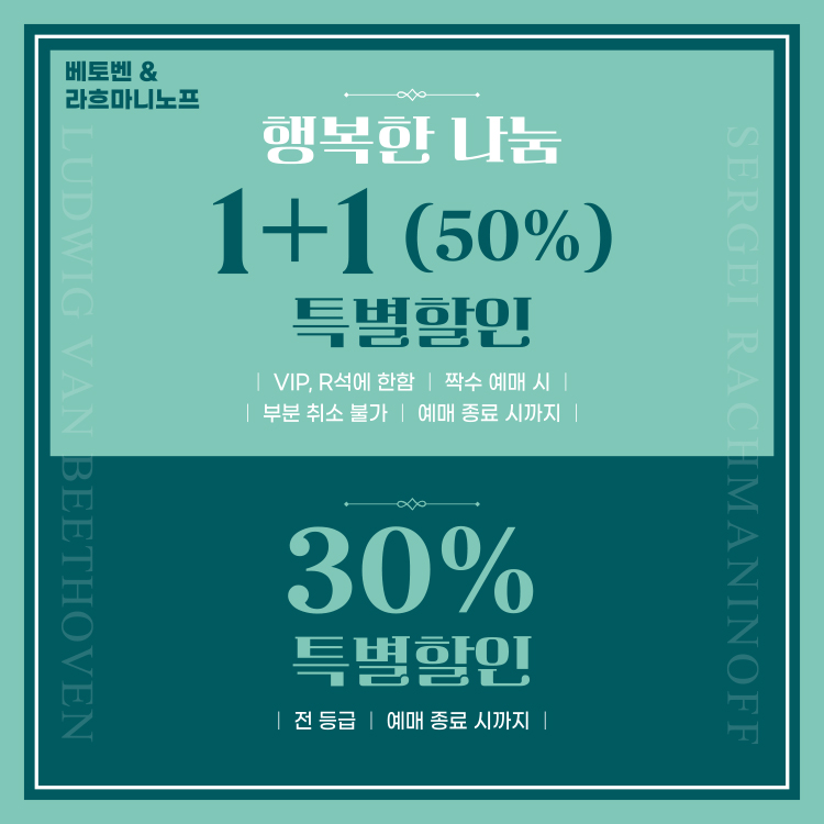- 행복한 나눔 1+1(50%) 특별할인 / VIP, R석에 한함 / 짝수 예매 시 / 부분 취소 불가 / 예매 종료 시까지
