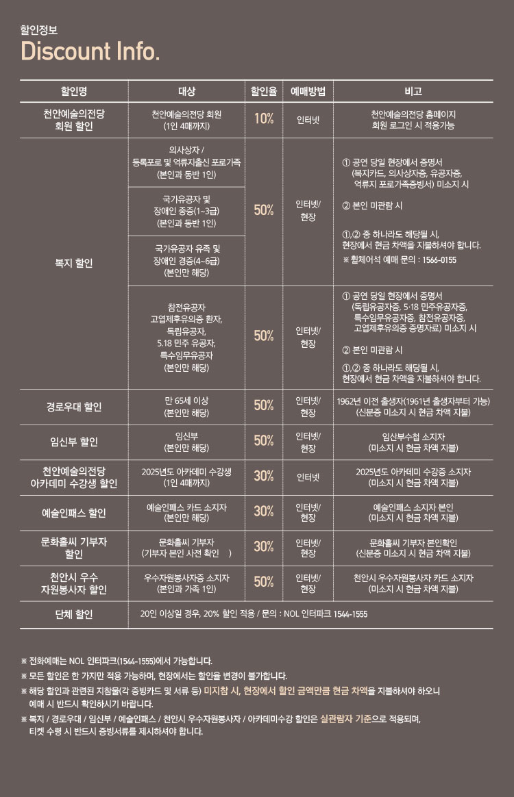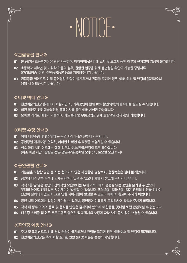 - 관람일 2일전 ~ 취소기한까지: 티켓금액의 30%