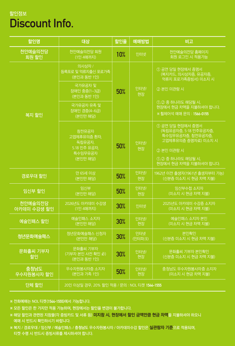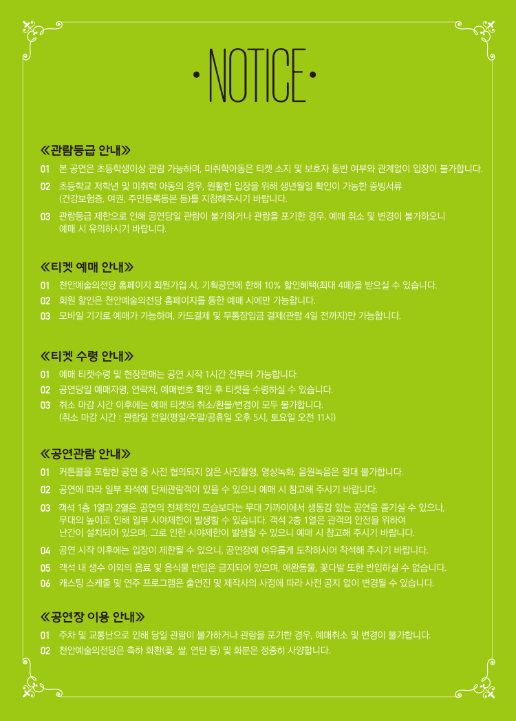 - 관람일 2일전 ~ 취소기한까지: 티켓금액의 30%