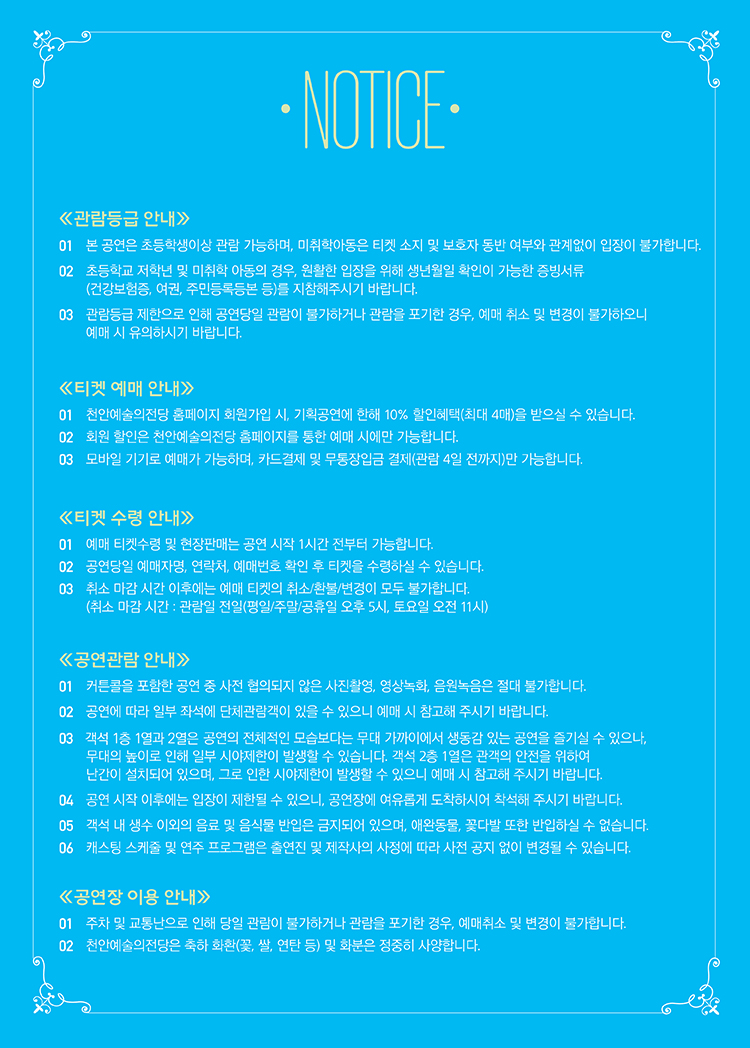 - 예매 후 7일 이내 취소시 티켓 금액 전액이 환불됩니다.(예매 수수료 제외)