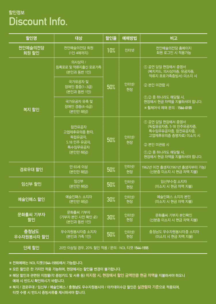 - 관람일 2일전 ~ 취소기한까지: 티켓금액의 30%
