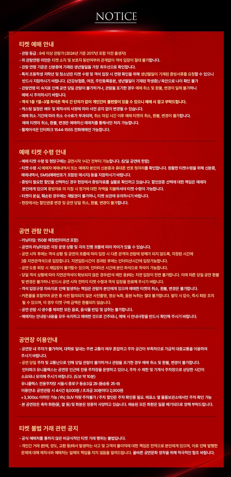 - 관람일 2일전 ~ 취소기한까지: 티켓금액의 30%