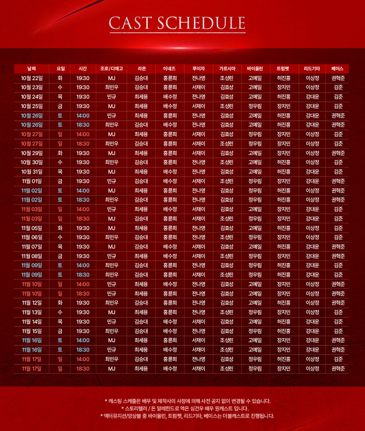 평일 19시 30분 / 주말 및 공휴일 14시, 18시 30분 (월 공연없음)