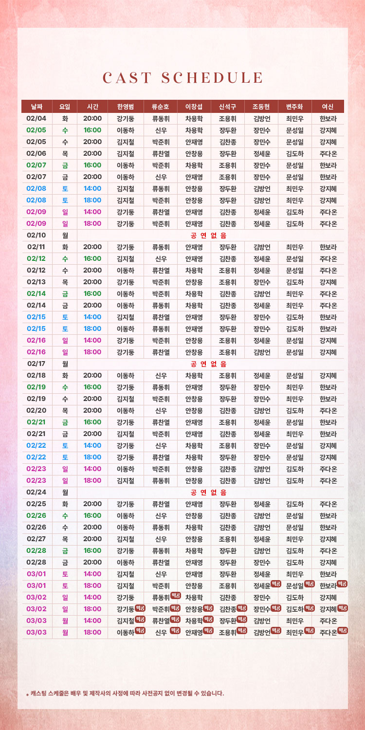 화, 목 8시 / 수, 금 4시, 8시 / 토, 일, 공휴일 2시, 6시