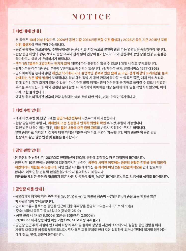 - 관람일 2일전 ~ 취소기한까지: 티켓금액의 30%
