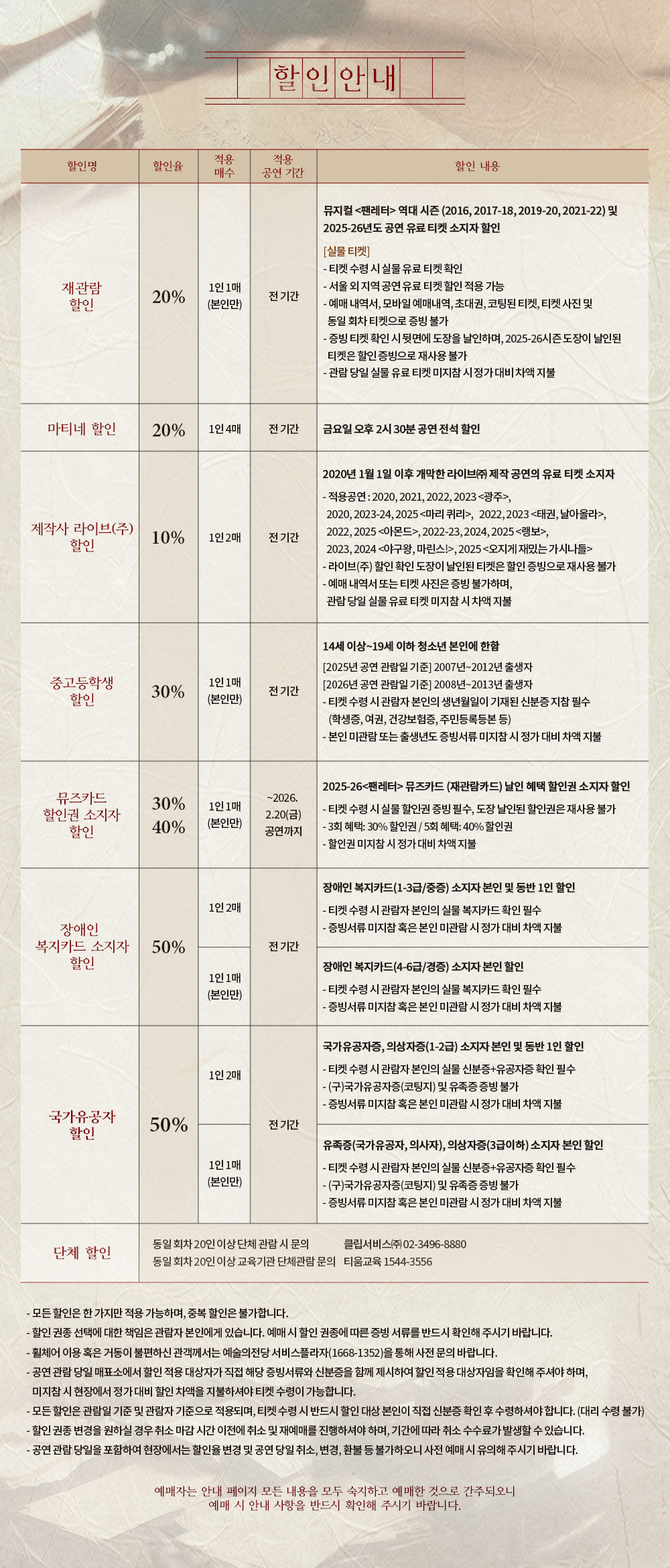 - 특정 기간, 특정 공연일에만 판매하는 가격이 있으니 예매 전 [가격 전체 보기]를 눌러 확인해 주세요.
