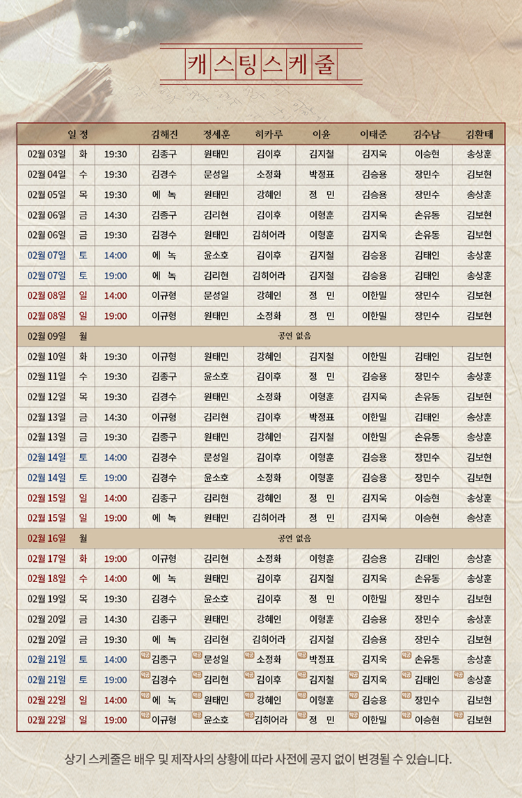 화, 수, 목 19:30 / 금 14:30, 19:30 / 토, 일 14:00, 19:00