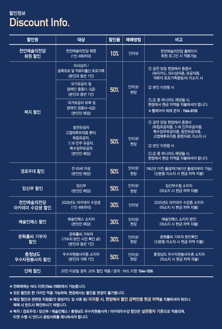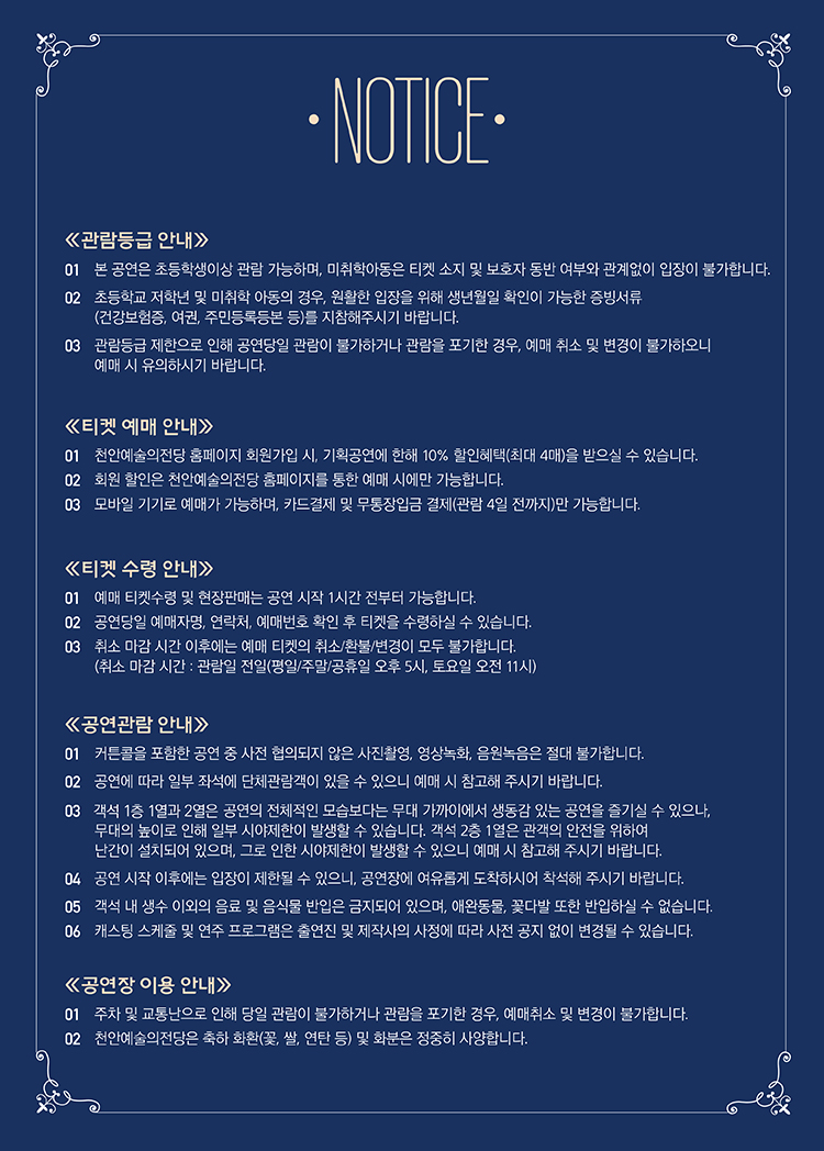 - 예매 후 7일 이내 취소시 티켓 금액 전액이 환불됩니다.(예매 수수료 제외)