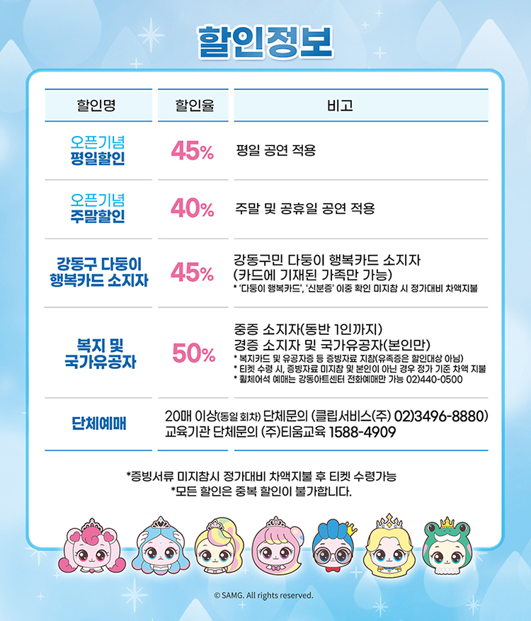 - 예매 후 7일 이내 취소시 티켓 금액 전액이 환불됩니다.(예매 수수료 제외)