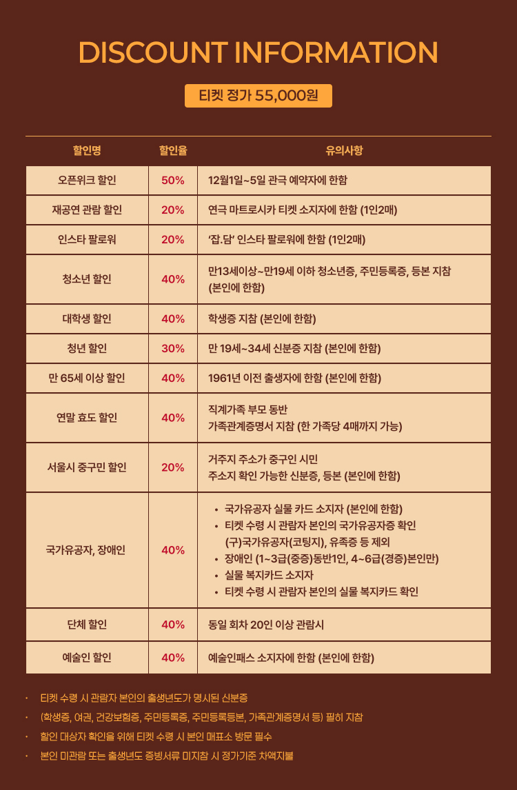 - 특정 기간, 특정 공연일에만 판매하는 가격이 있으니 예매 전 [가격 전체 보기]를 눌러 확인해 주세요.