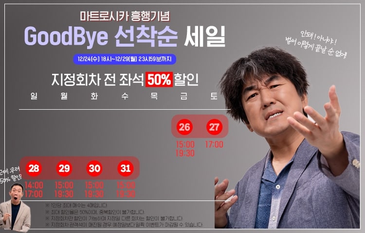 12/22~31 평일 15시, 19시 30분 / 주말, 공휴일(12/25) 14시, 17시