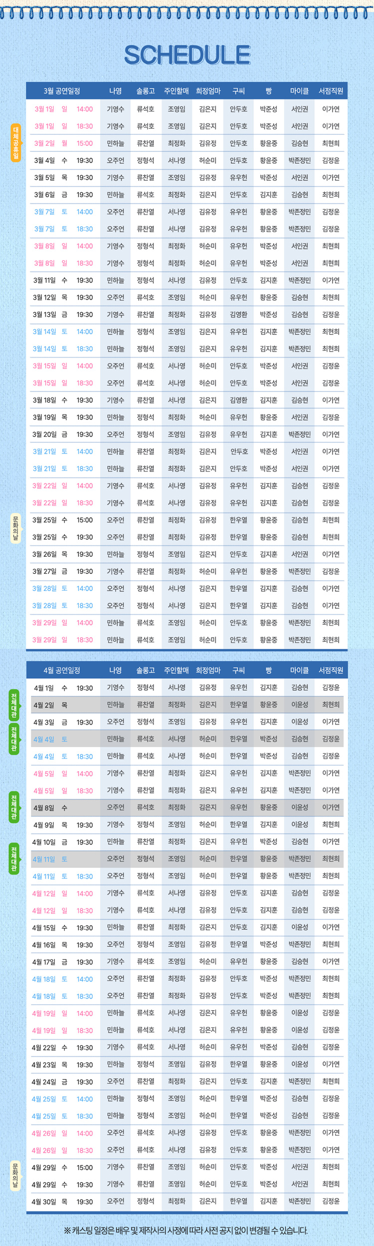 - 4월 2일(목), 4월 4일(토) 14:00, 4월 8일(수), 4월 11일(토) 14:00 공연은 전체대관으로 인해 사전 마감되었습니다.