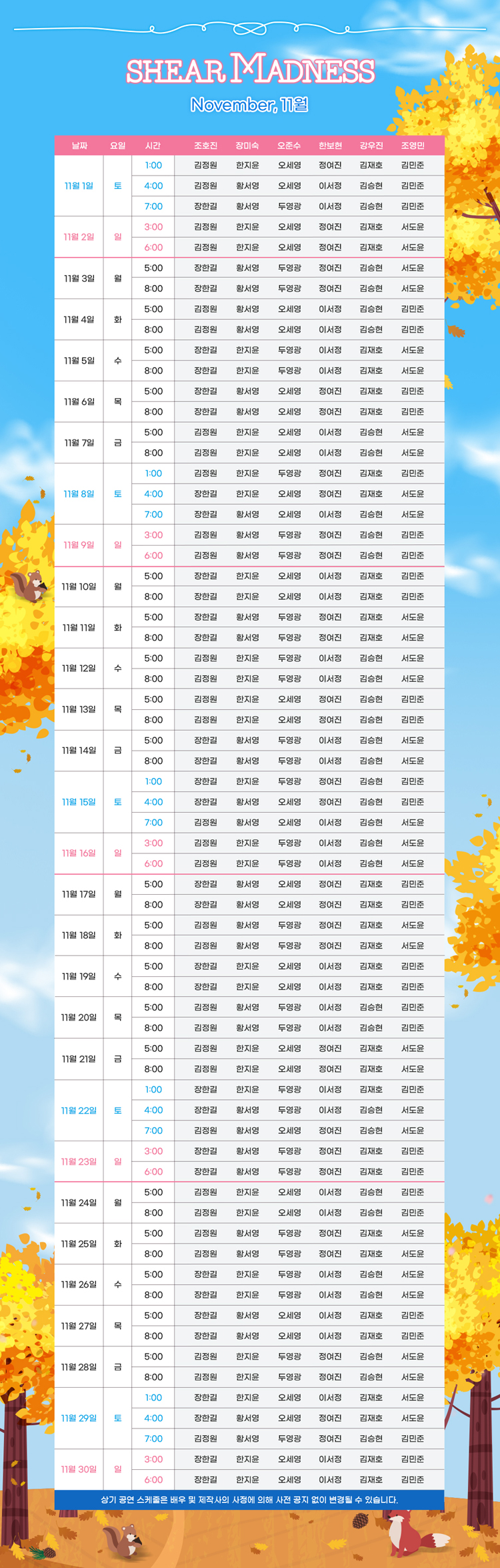 월 ~ 금 5시, 8시 / 토,공휴일 1시, 4시, 7시 / 일 3시, 6시