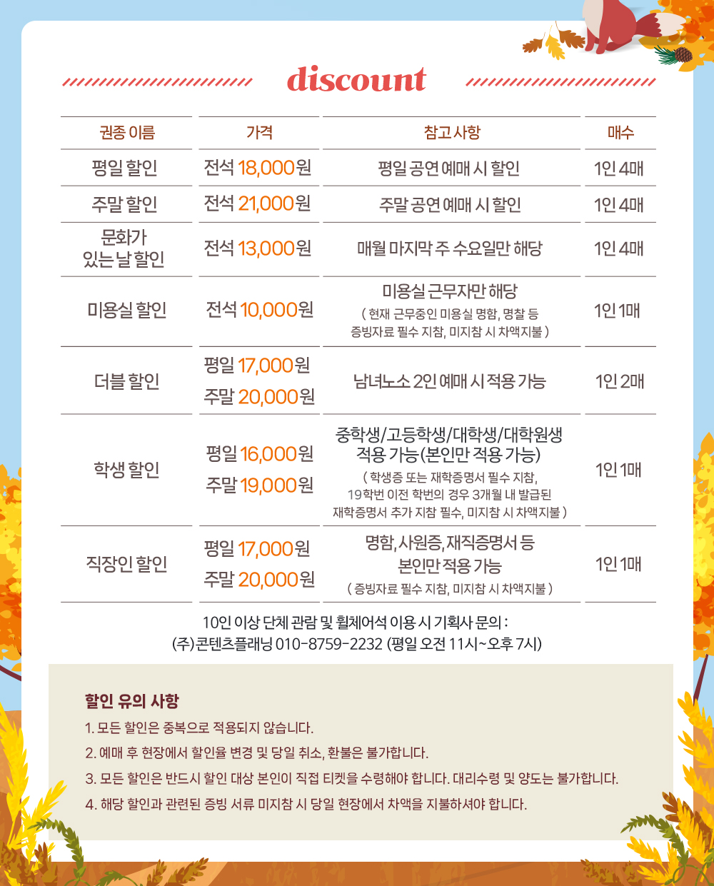 - 관람일 2일전 ~ 취소기한까지: 티켓금액의 30%
