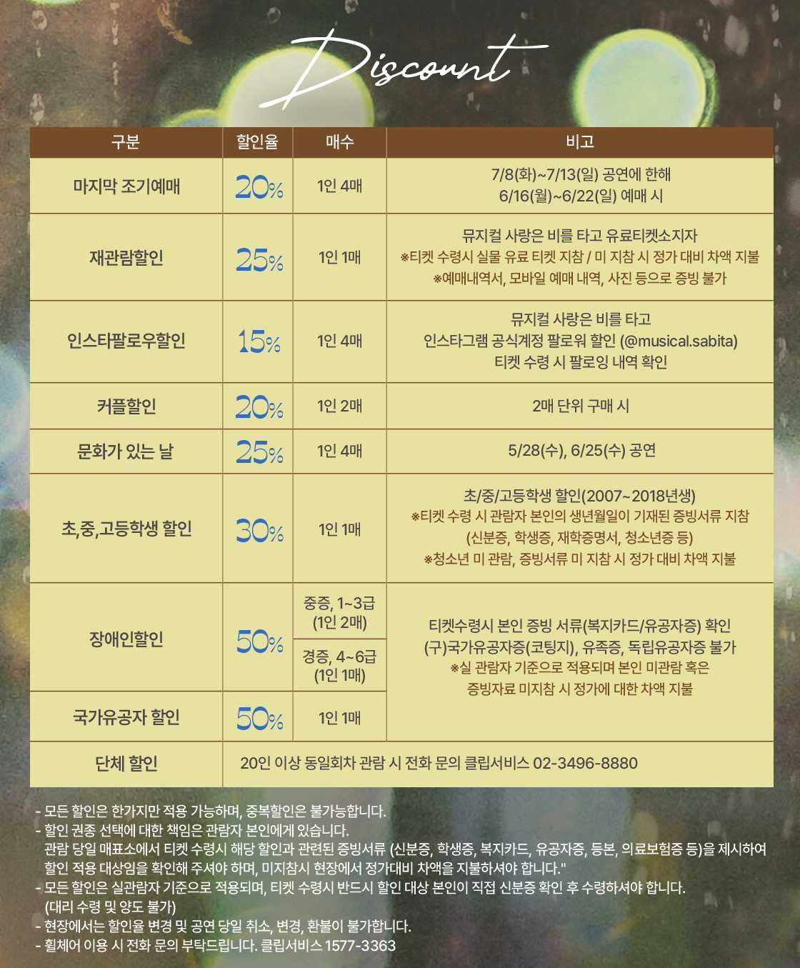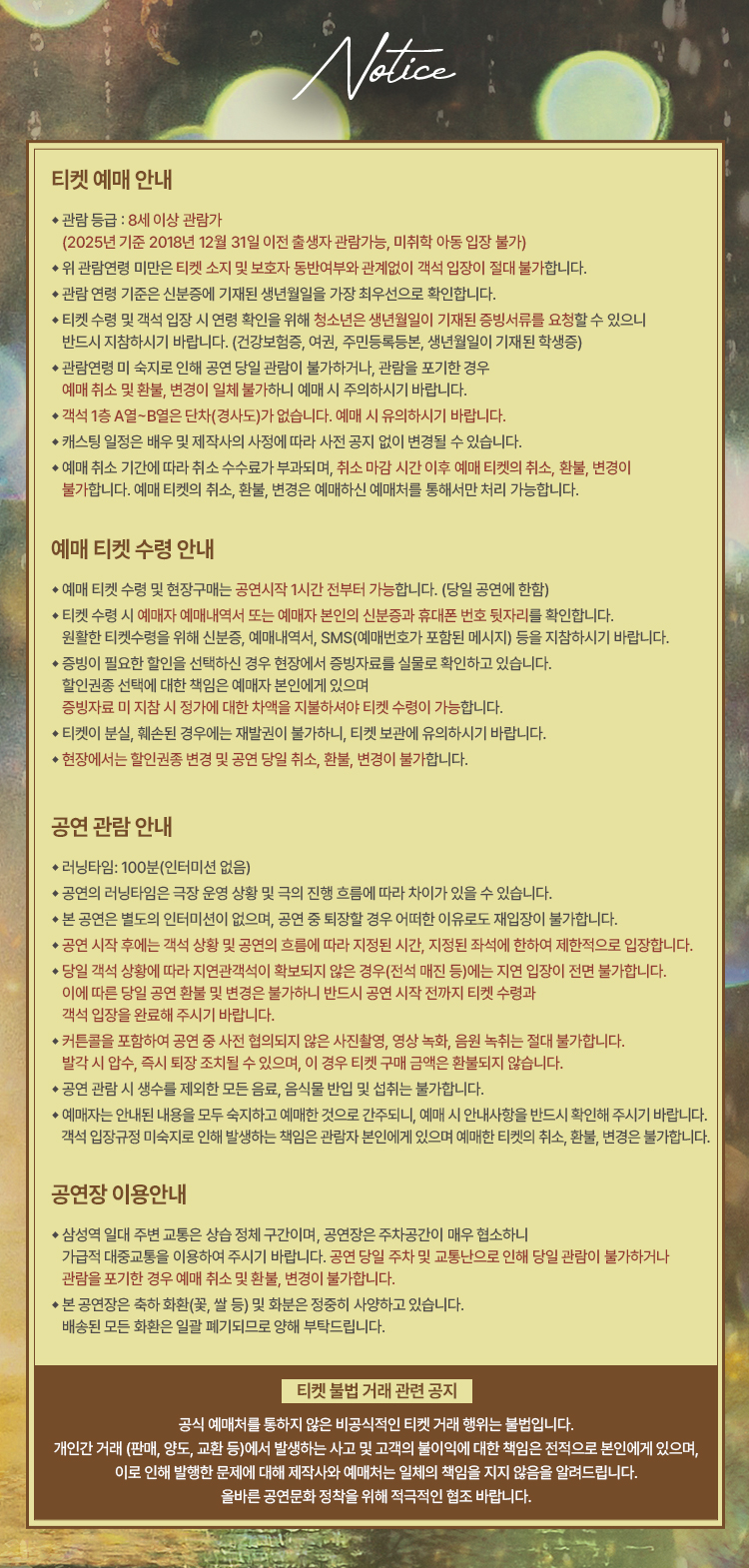 캐스팅 변경으로 인한 예매 취소 및 변경은 7월 11일(금) 17시까지 예매처 고객센터를 통해 신청해 주시면 수수료 없이 처리됩니다. ※ 웹/앱에서 직접 취소 시 수수료가 발생하니 유의 부탁드립니다.