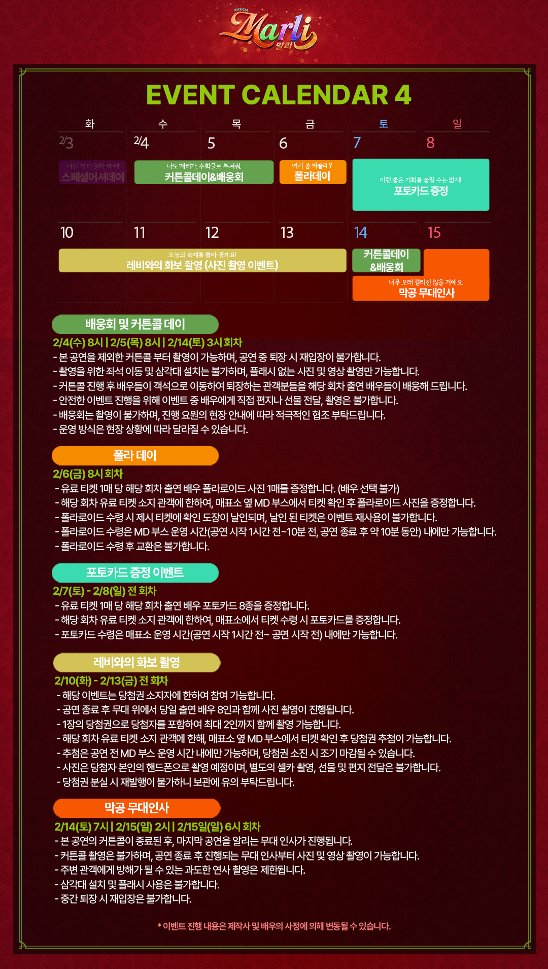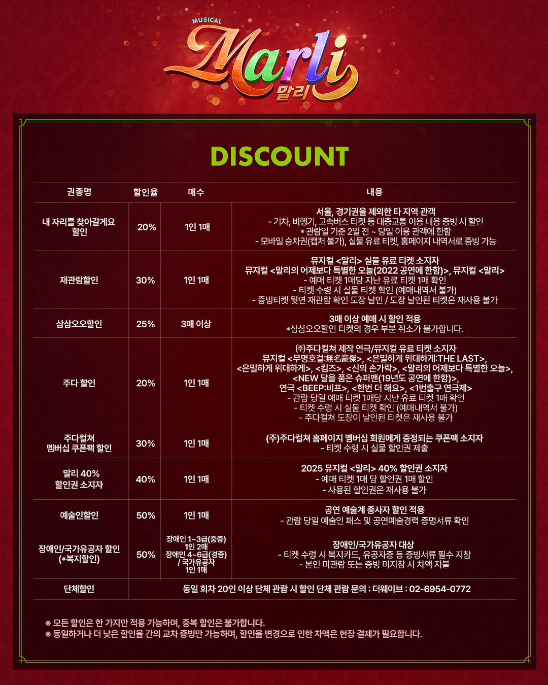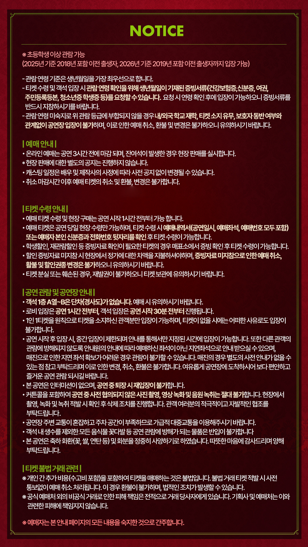 - 관람일 2일전 ~ 취소기한까지: 티켓금액의 30%
