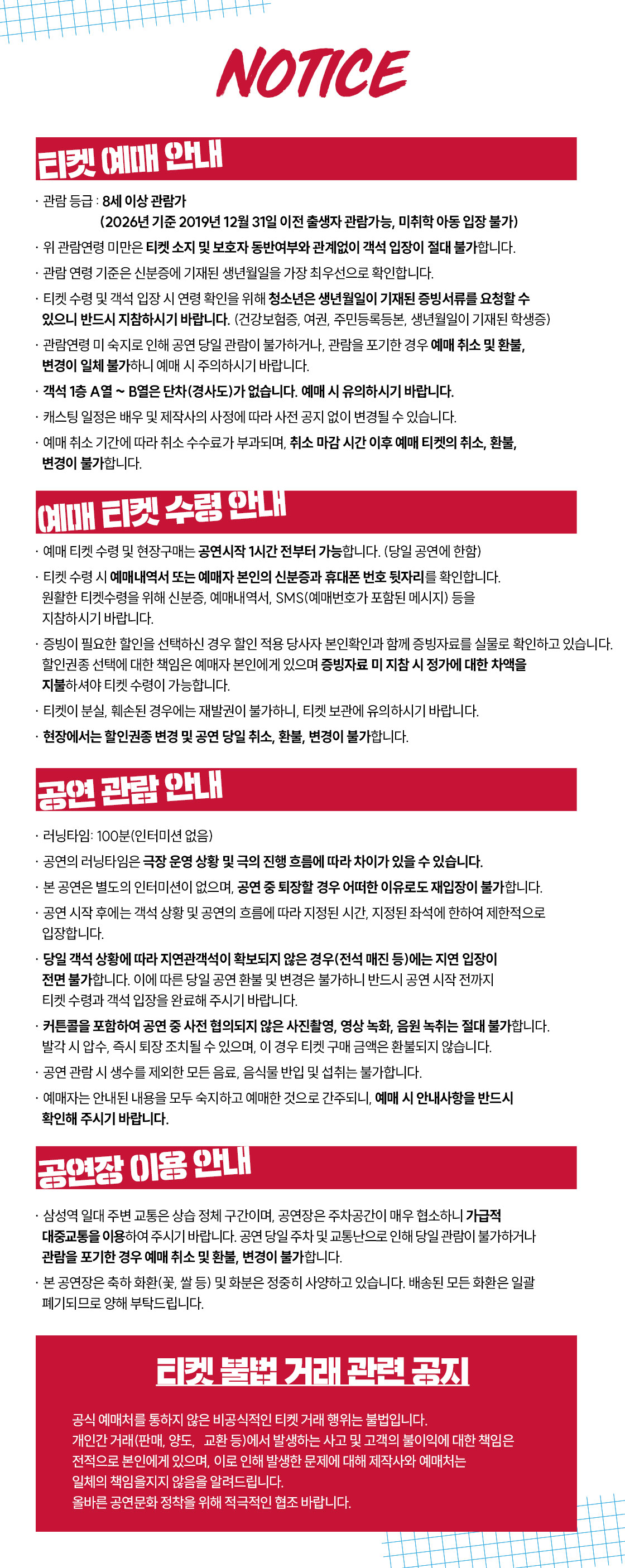- 예매 티켓 수령/할인/증빙(차액), 관람 연령, 공연 장소, 교통/주차, 좌석에 따른 안내 미숙지는 관람자 본인에게 책임이 있으며, 해당 사유로 인한 예매 티켓의 취소/환불/변경은 불가합니다.