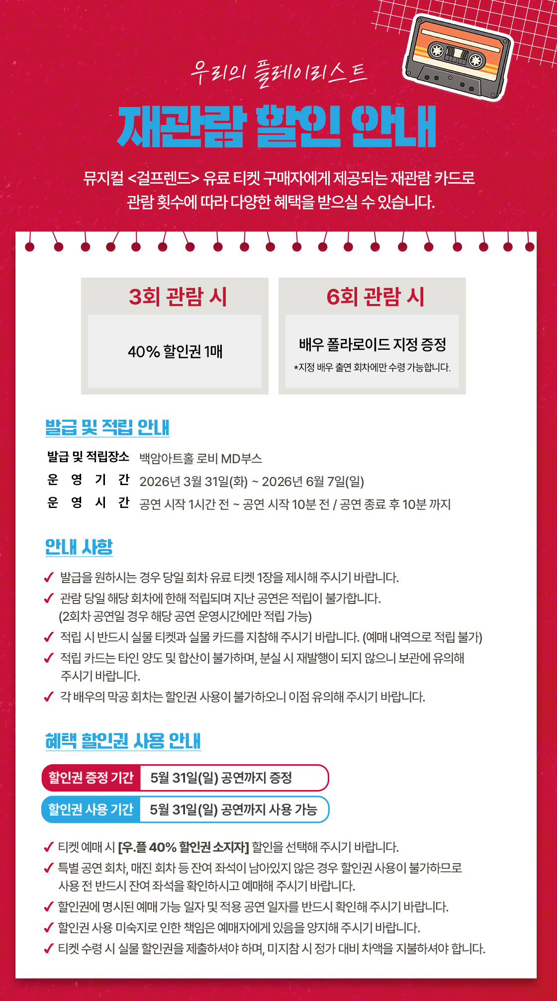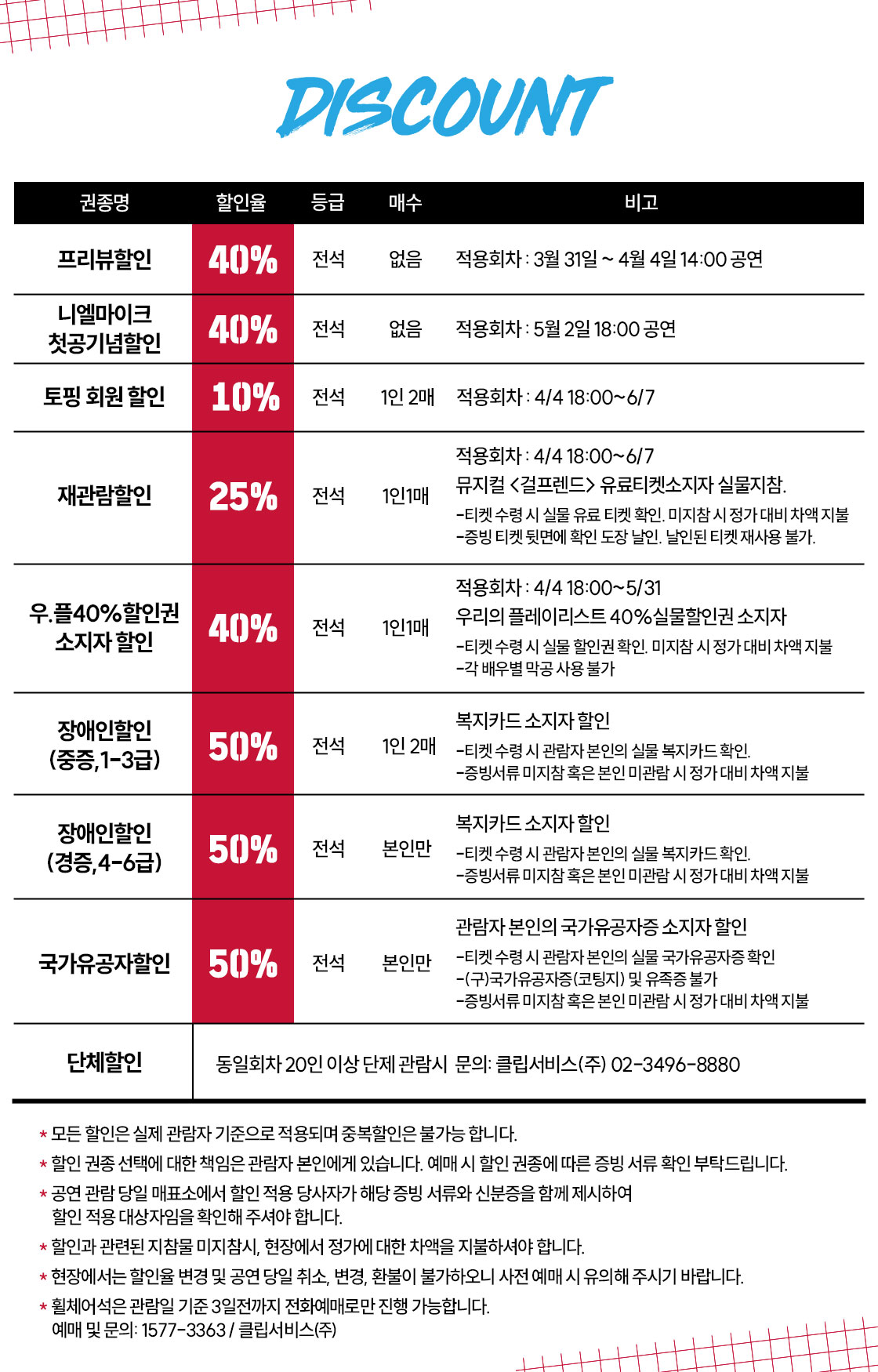 - 현장에서는 할인권종 변경 및 공연 당일 취소, 환불, 변경이 불가합니다.