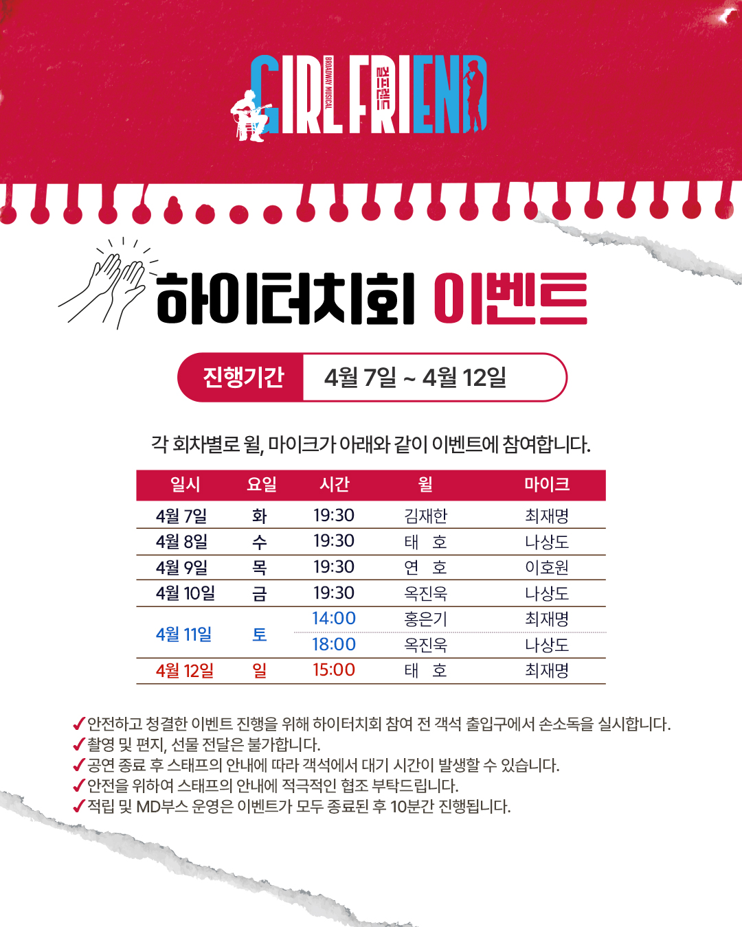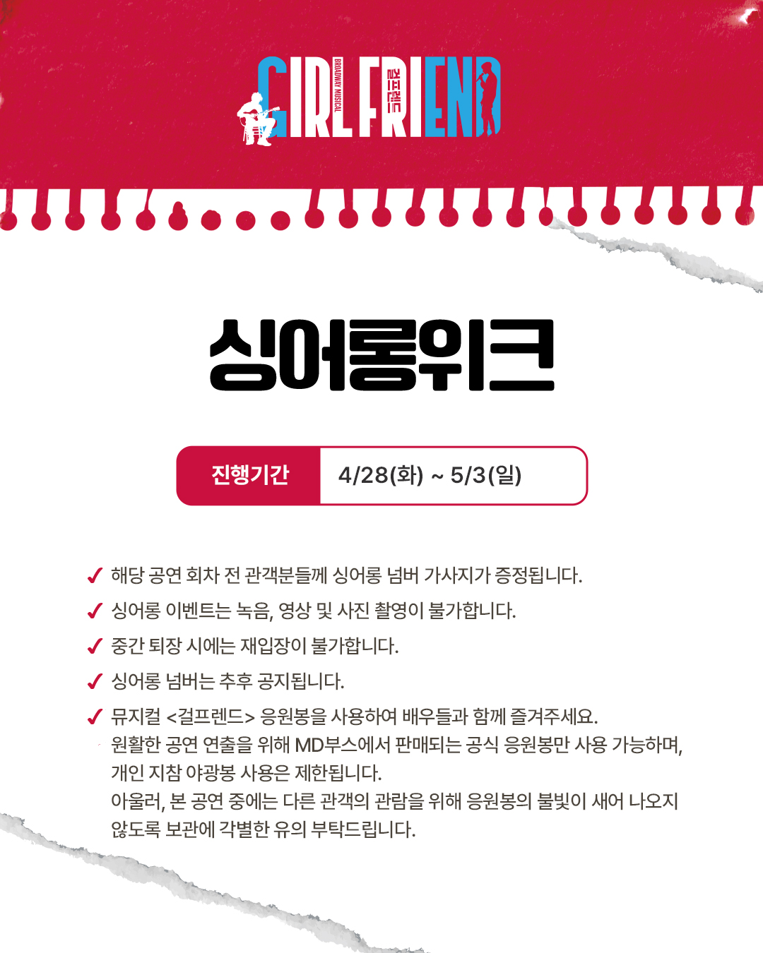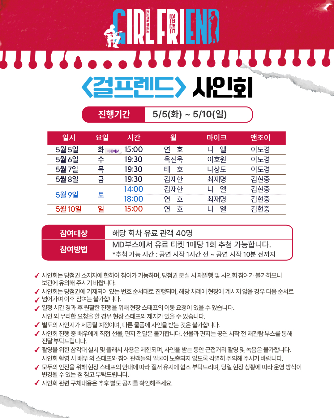 - 티켓 수령 및 객석 입장 시 연령 확인을 위해 청소년은 생년월일이 기재된 증빙서류를 요청할 수 있으니 반드시 지참하시기 바랍니다. (건강보험증, 여권, 주민등록등본, 생년월일이 기재된 학생증)