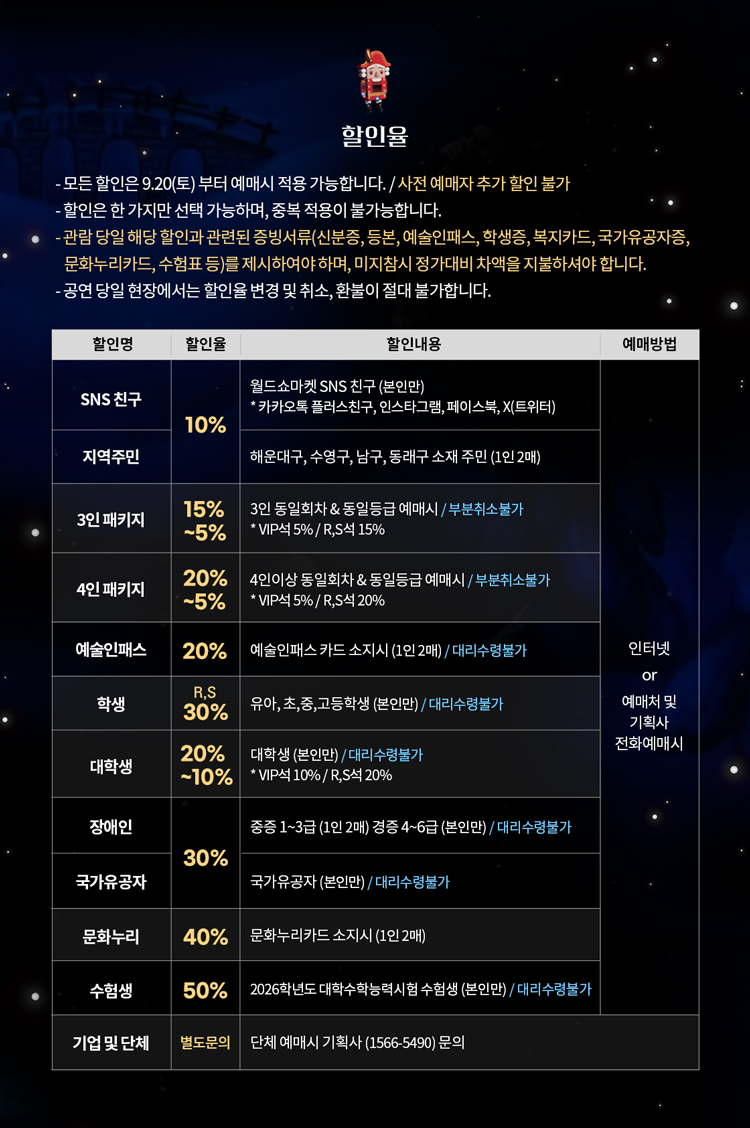 - 특정 기간, 특정 공연일에만 판매하는 가격이 있으니 예매 전 [가격 전체 보기]를 눌러 확인해 주세요.