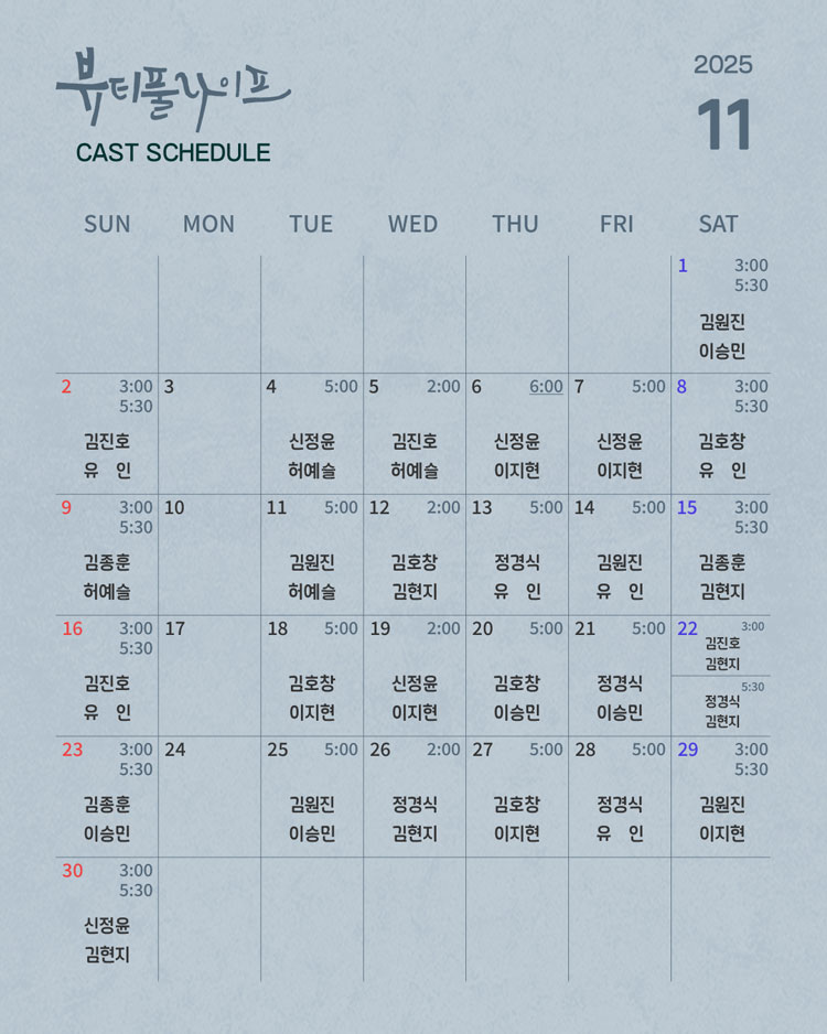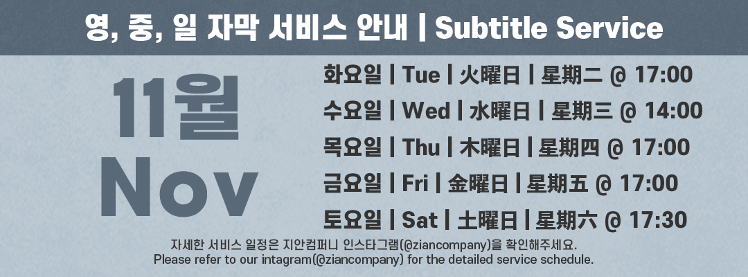 [ 11월 ] 화 5:00 / 수 2:00 / 목 5:00 / 금 5:00 / 토 3:00,5:30 / 일 3:00,5:30