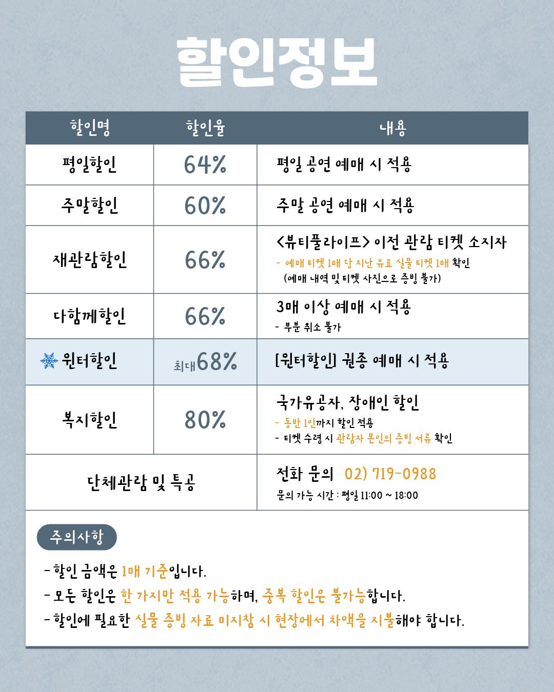 - 관람일 2일전 ~ 취소기한까지: 티켓금액의 30%