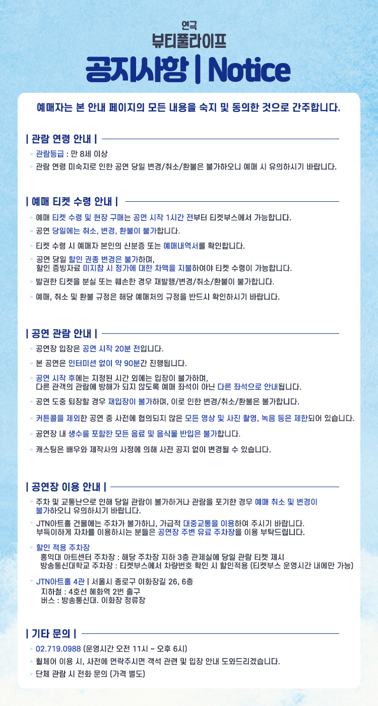 - 예매 후 7일 이내 취소시 티켓 금액 전액이 환불됩니다.(예매 수수료 제외)
