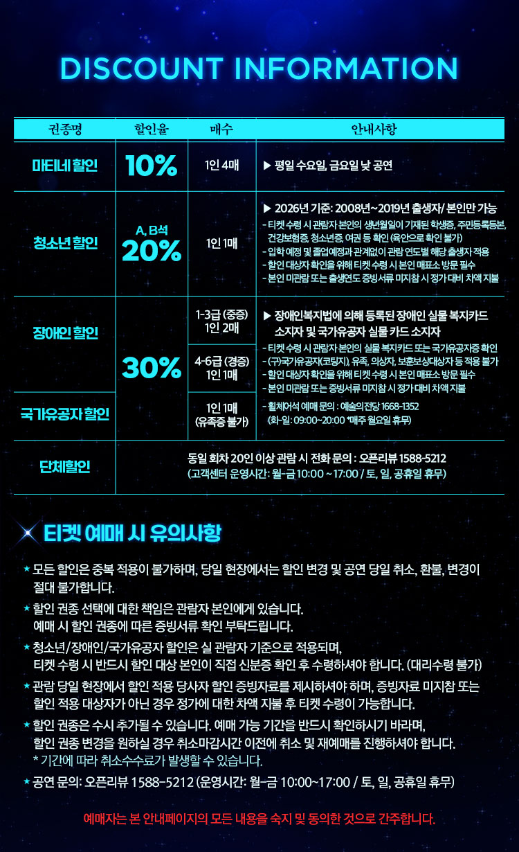 - 특정 기간, 특정 공연일에만 판매하는 가격이 있으니 예매 전 [가격 전체 보기]를 눌러 확인해 주세요.