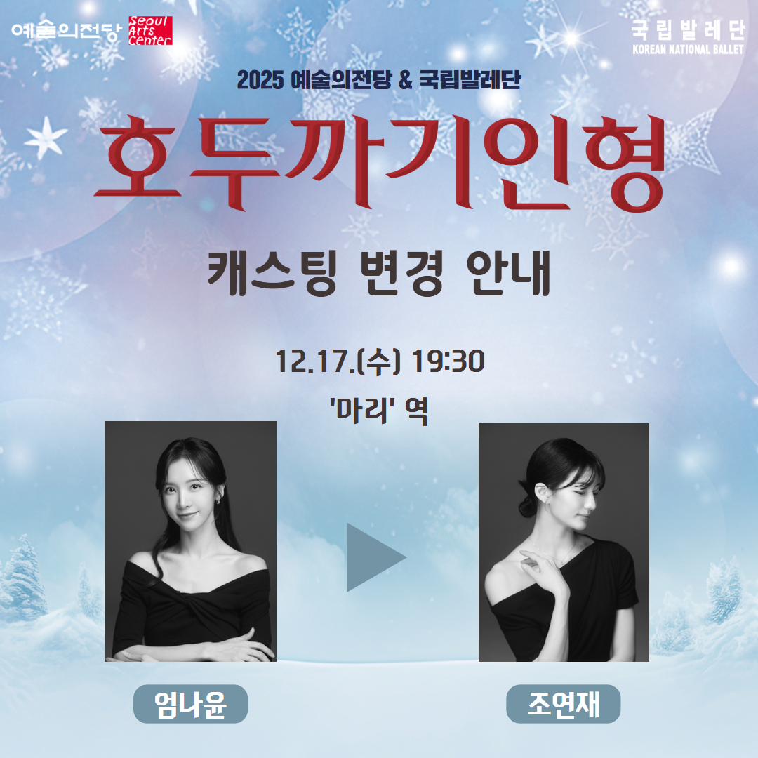 지난 2000년부터 매년 겨울 예술의전당과 국립발레단이 함께 선보이며 전석 매진 행렬을 이어온 연말 공연의 스테디셀러 <호두까기인형>! <호두까기인형>은 볼쇼이발레단을 33년간 이끌며 러시아 발레의 ‘살아있는 신화’로 불리는 유리 그리고로비치의 버전으로, 전 세계 곳곳의 크리스마스를 수놓는 다양한 버전의 공연 중 가장 웅장하고도 스펙터클한 구성을 자랑하는 작품입니다. 차이콥스키의 낭만적인 음악 위에 다채로운 춤이 한 데 어우러진 이 공연은 화려한 볼거리와 고난이도의 안무로 오페라극장을 찾는 모든 관객들에게 올 겨울에도 어김없이 큰 감동을 선사할 것입니다.