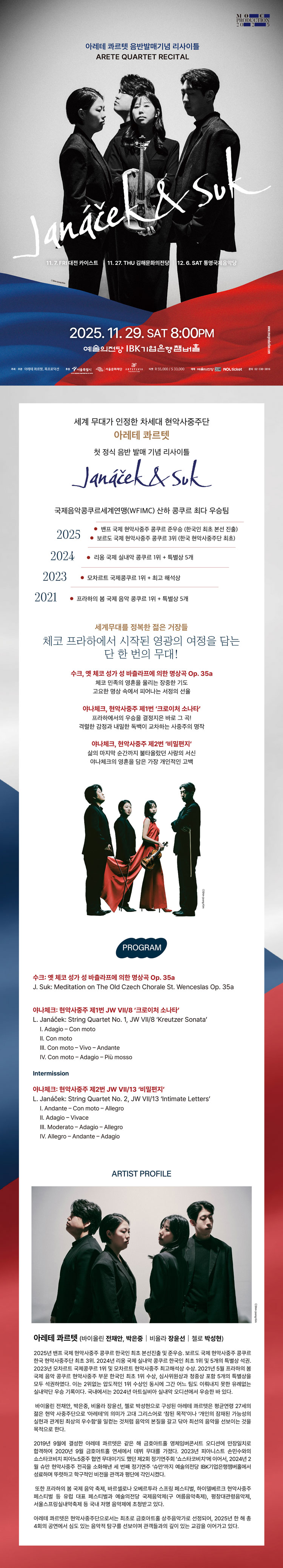 본고장에서 인정받은 탁월한 연주력과 심도 깊은 해석을 바탕으로 체코를 대표하는 두 거장의 음악 세계를 온전히 펼쳐 보일 아레테 콰르텟의 여정에 여러분을 초대한다.