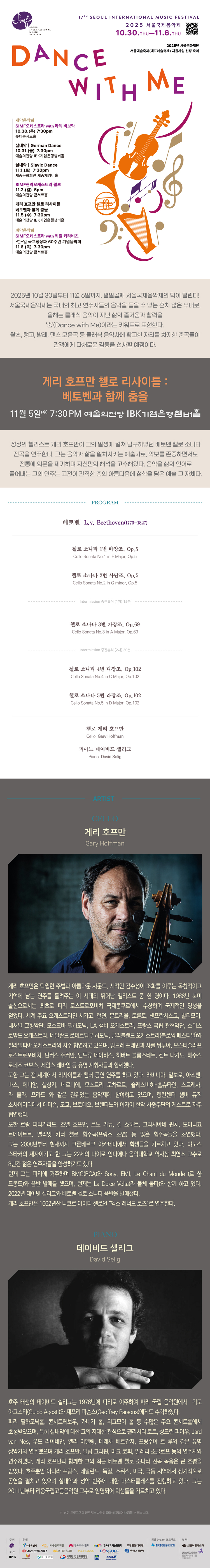 정상의 첼리스트 게리 호프만이 그의 일생에 걸쳐 탐구하였던 베토벤 첼로 소나타 전곡을 연주한다. 그는 음악과 삶을 일치시키는 예술가로, 악보를 존중하면서도 전통에 의문을 제기하며 자신만의 해석을 고수해왔다. 음악을 삶의 언어로 풀어내는 그의 연주는 고전이 간직한 춤의 아름다움에 철학을 담은 예술 그 자체다.