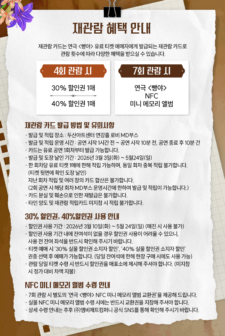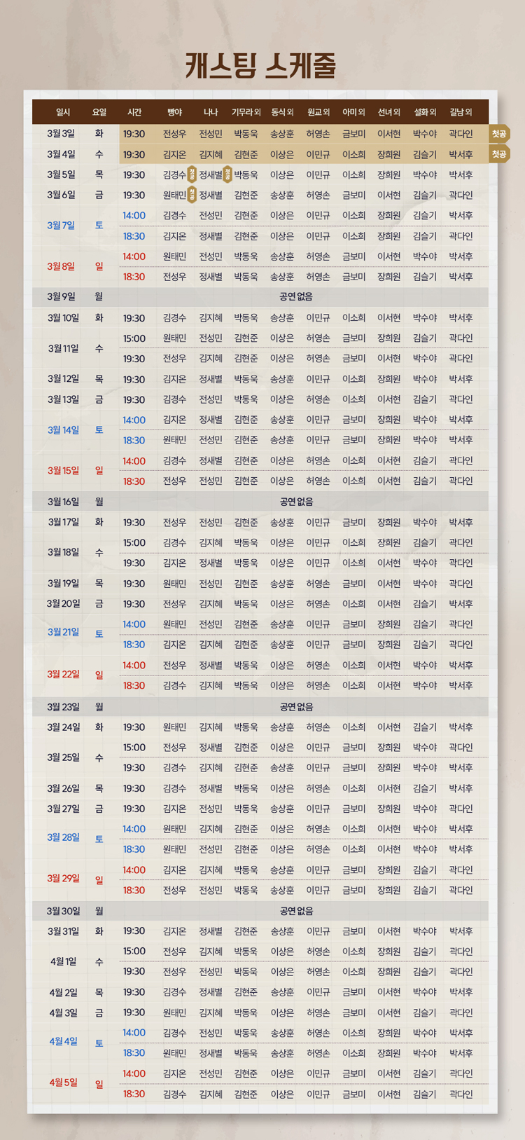 화,목,금 7시 30분 | 수 3시, 7시 30분 | 토,일 및 공휴일 2시, 6시 30분 (월 공연 없음)