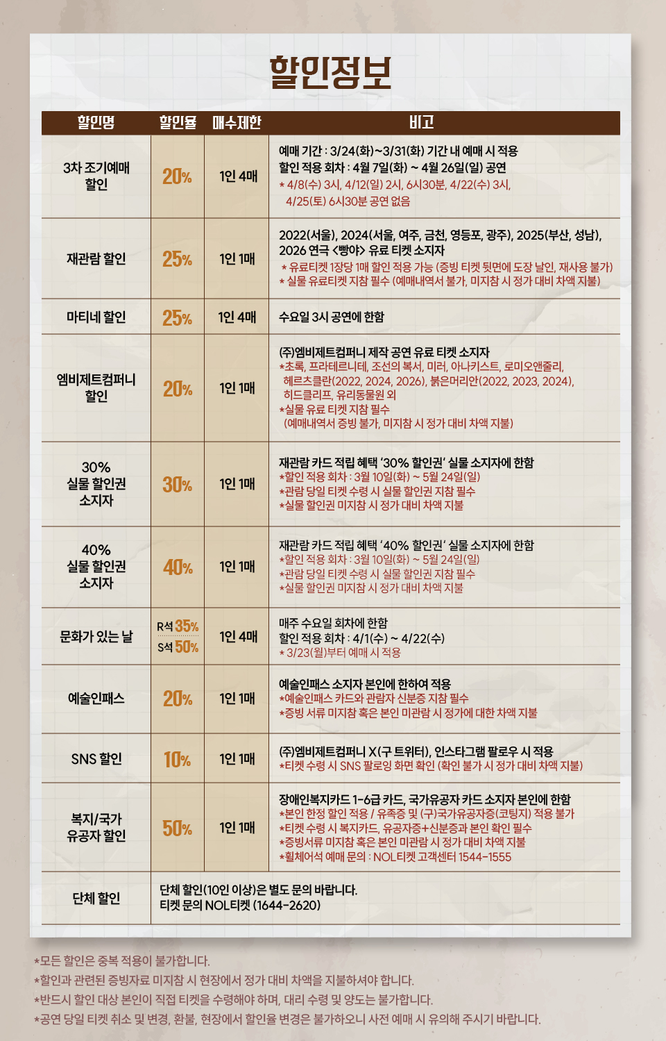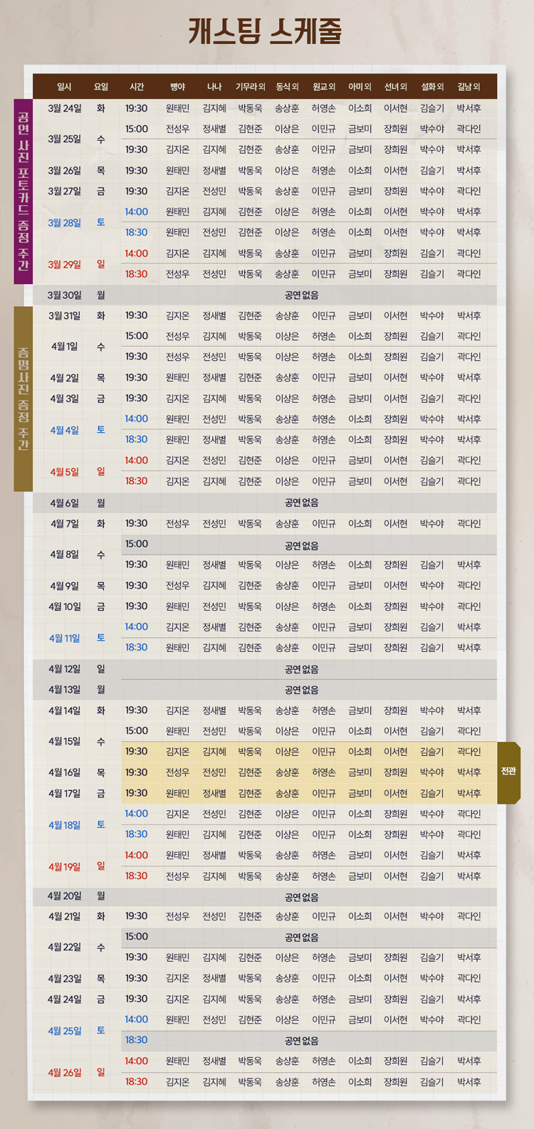 단, 4/8(수) 3시, 4/12(일) 2시, 6시30분, 4/22(수) 3시, 4/25(토) 6시 30분 공연 없음