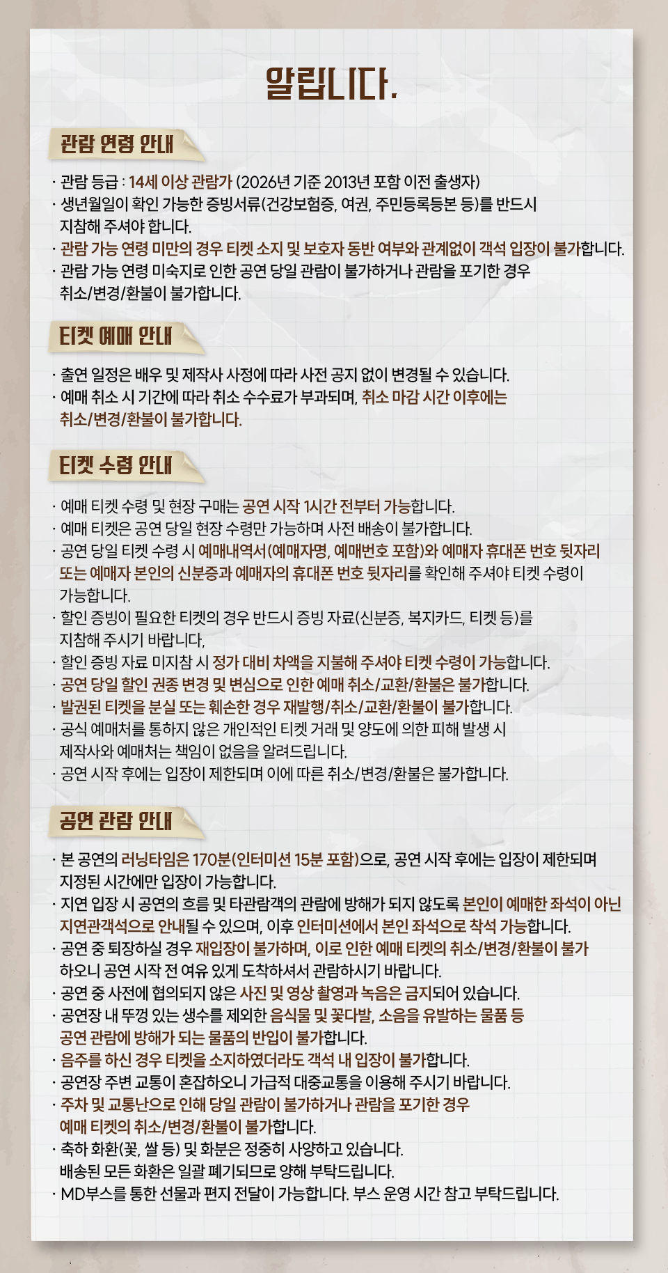 - 관람일 2일전 ~ 취소기한까지: 티켓금액의 30%