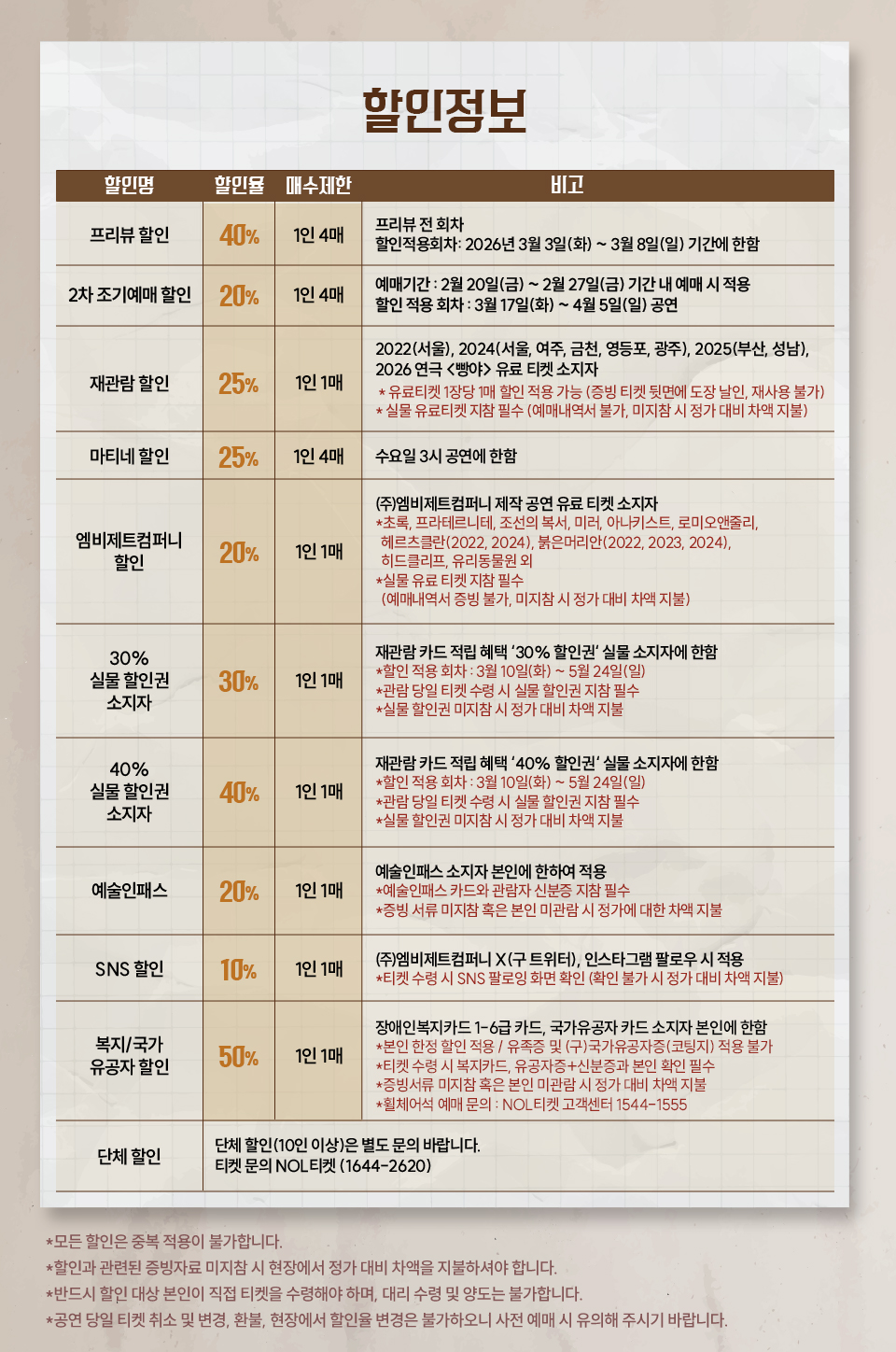 - 특정 기간, 특정 공연일에만 판매하는 가격이 있으니 예매 전 [가격 전체 보기]를 눌러 확인해 주세요.