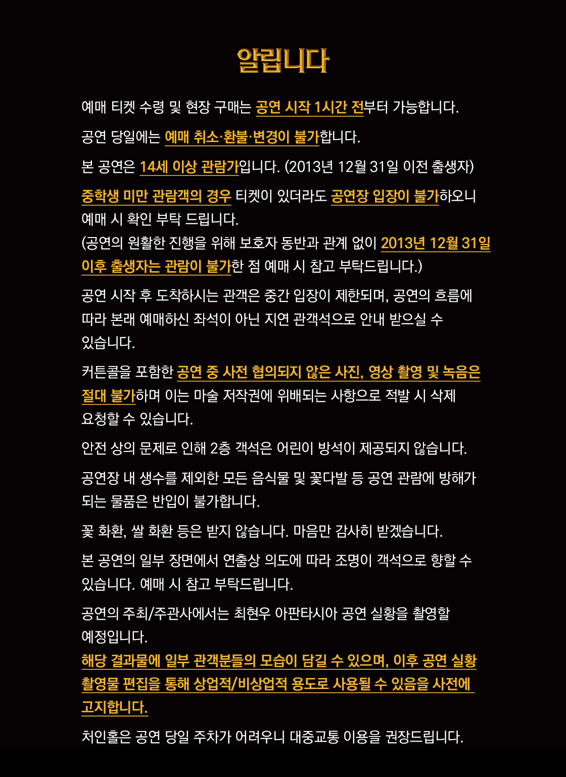 - 특정 기간, 특정 공연일에만 판매하는 가격이 있으니 예매 전 [가격 전체 보기]를 눌러 확인해 주세요.