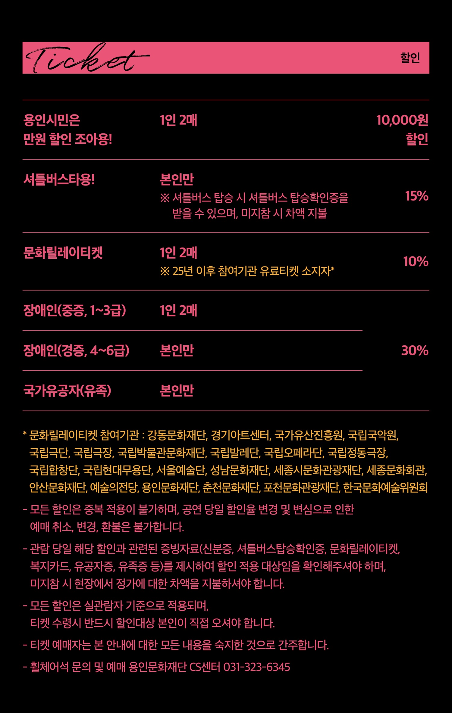 - 관람일 2일전 ~ 취소기한까지: 티켓금액의 30%