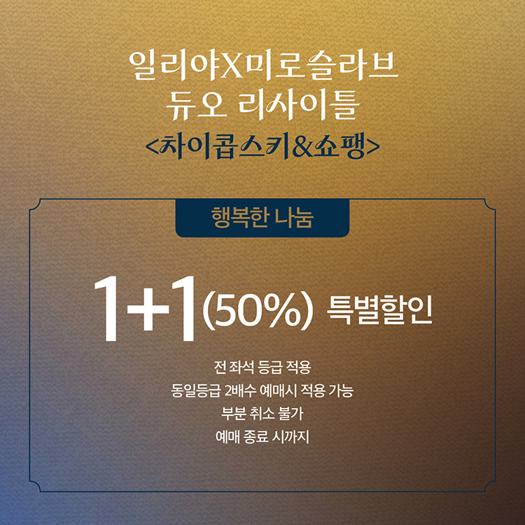 - 행복한 나눔 1+1(50%) 특별할인 : 전 좌석 등급 적용 / 동일등급 2배수 예매시 적용 가능 / 부분 취소 불가 / 예매 종료 시까지