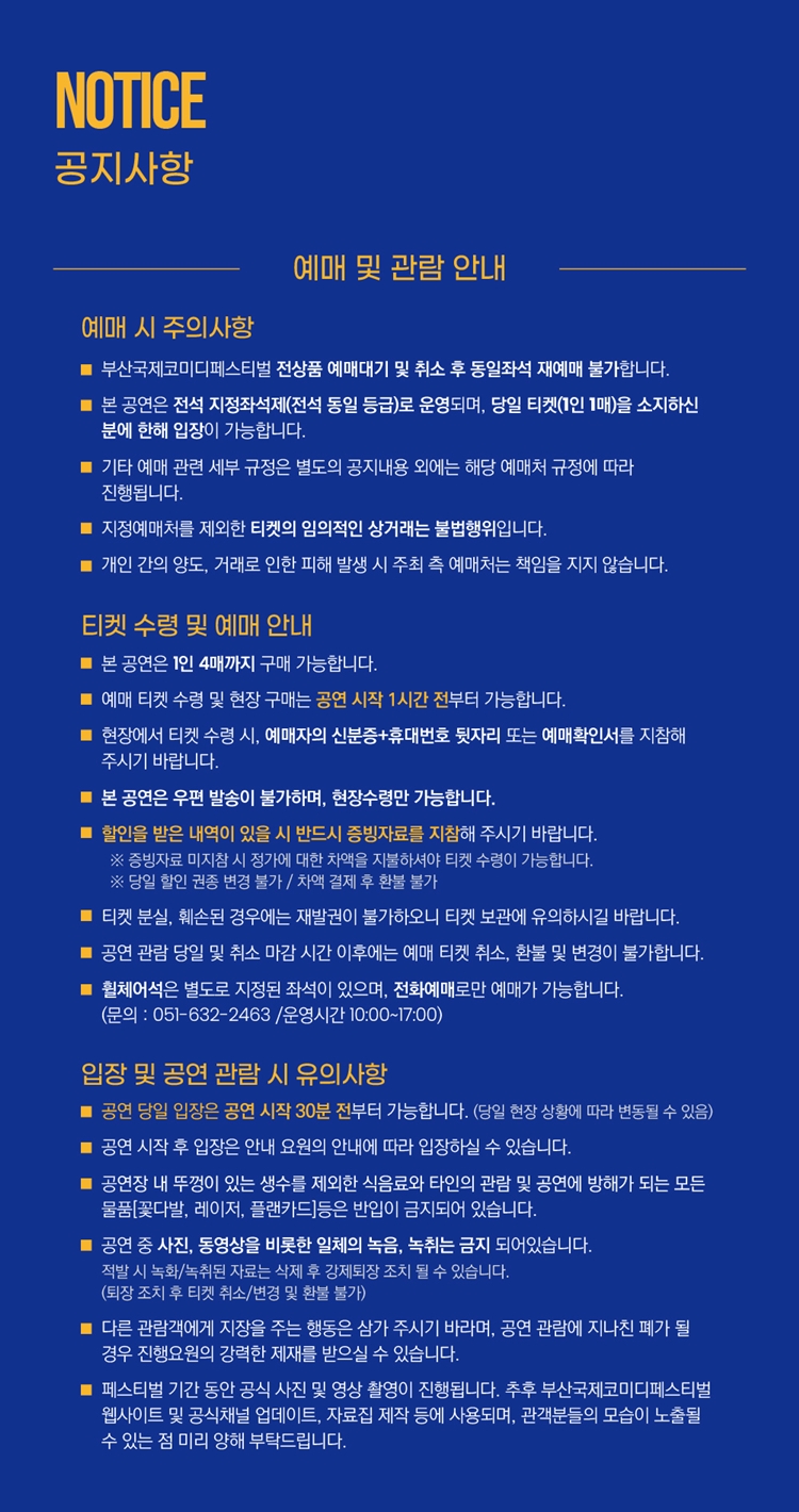 - 예매 후 7일 이내 취소시 티켓 금액 전액이 환불됩니다.(예매 수수료 제외)
