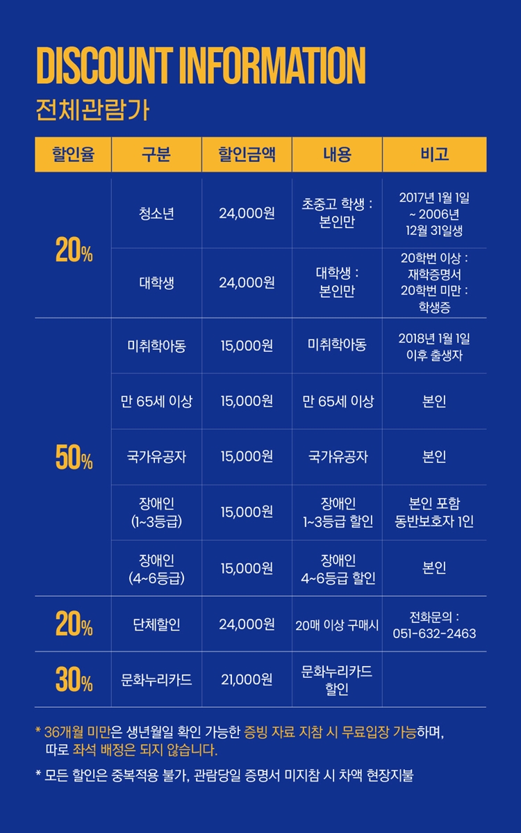 - 관람일 2일전 ~ 취소기한까지: 티켓금액의 30%