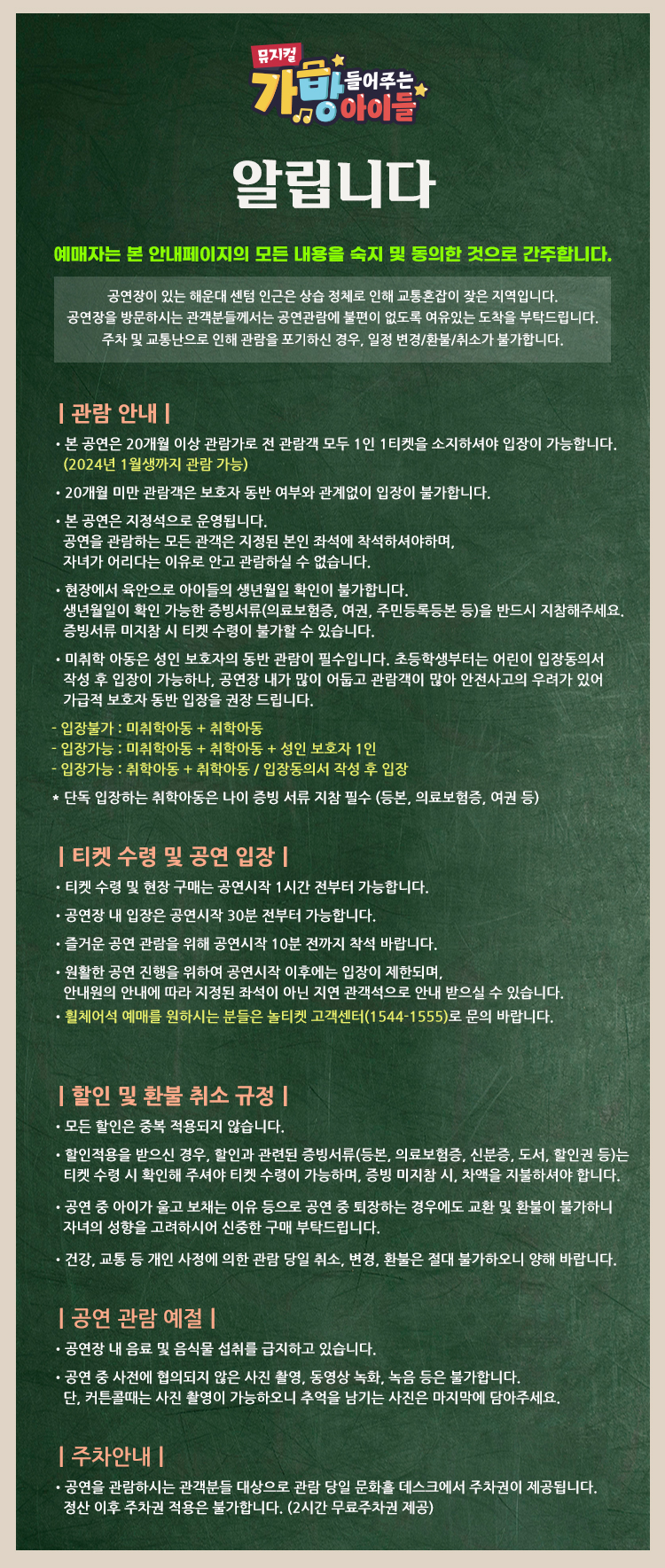 - 예매 후 7일 이내 취소시 티켓 금액 전액이 환불됩니다.(예매 수수료 제외)