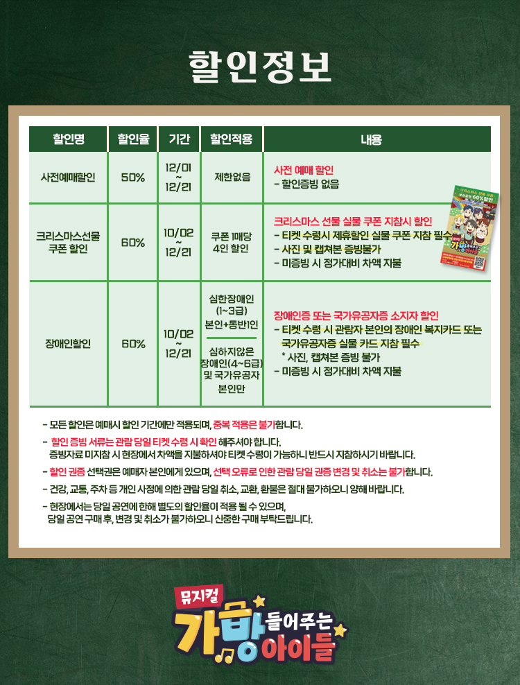 - 관람일 2일전 ~ 취소기한까지: 티켓금액의 30%